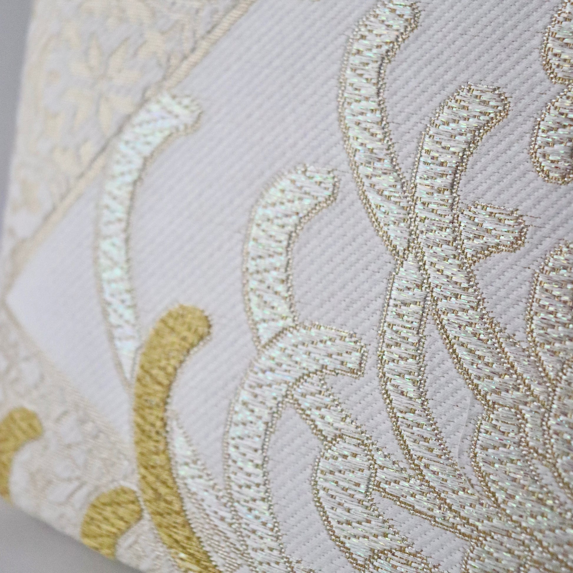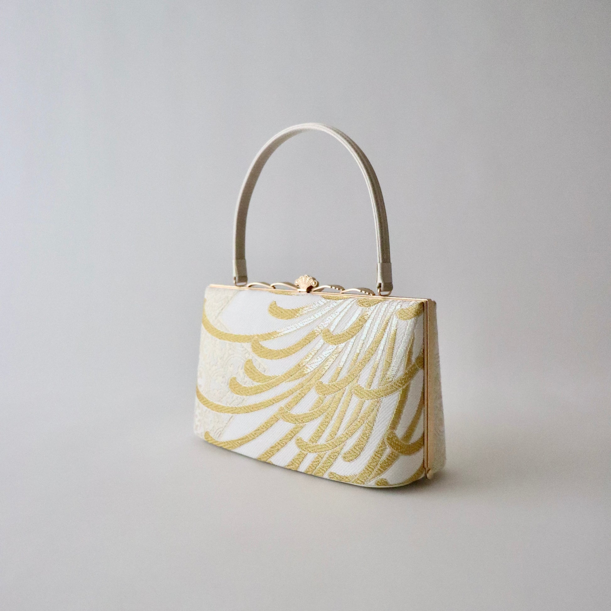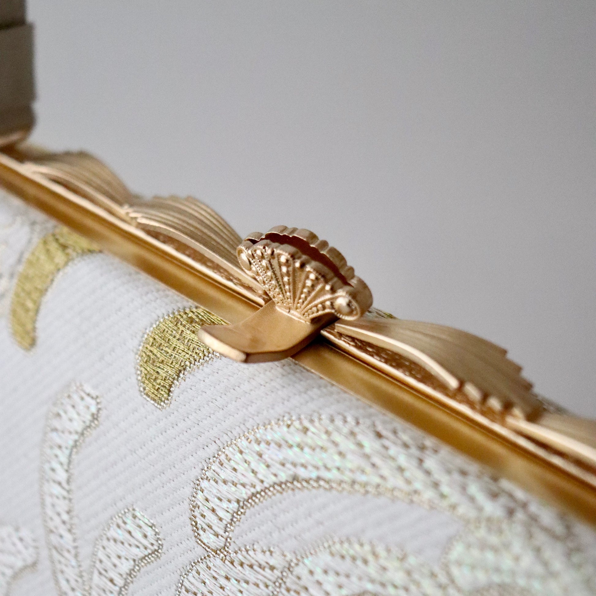 金糸銀糸のコントラストが美しい本作。京都西陣で織り上げた「糸菊」模様の帯地が上品で華やかな仕上がり。真鍮製の留め具の装飾も上品で豪華。慶事の席の装いに相応しいお品物です。
