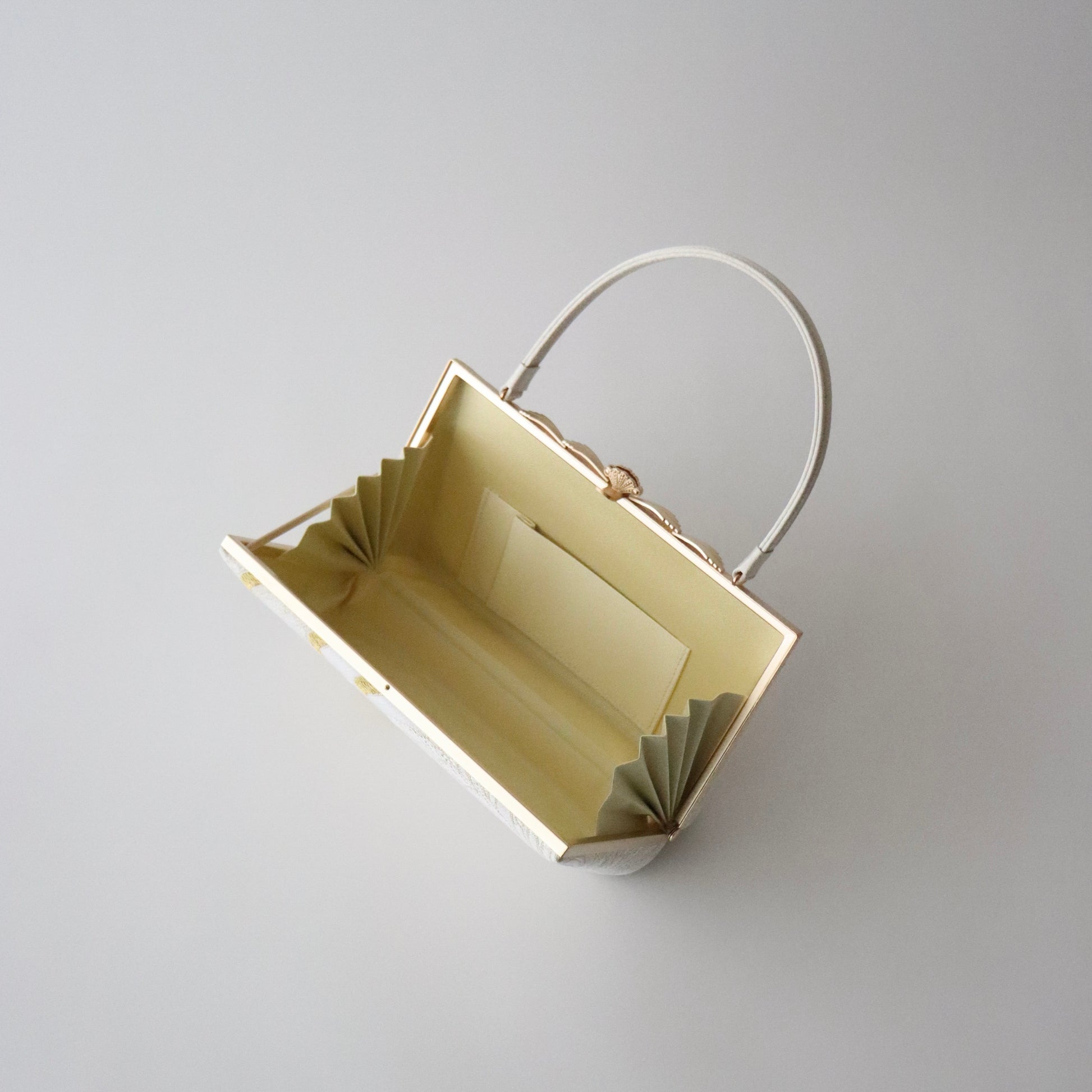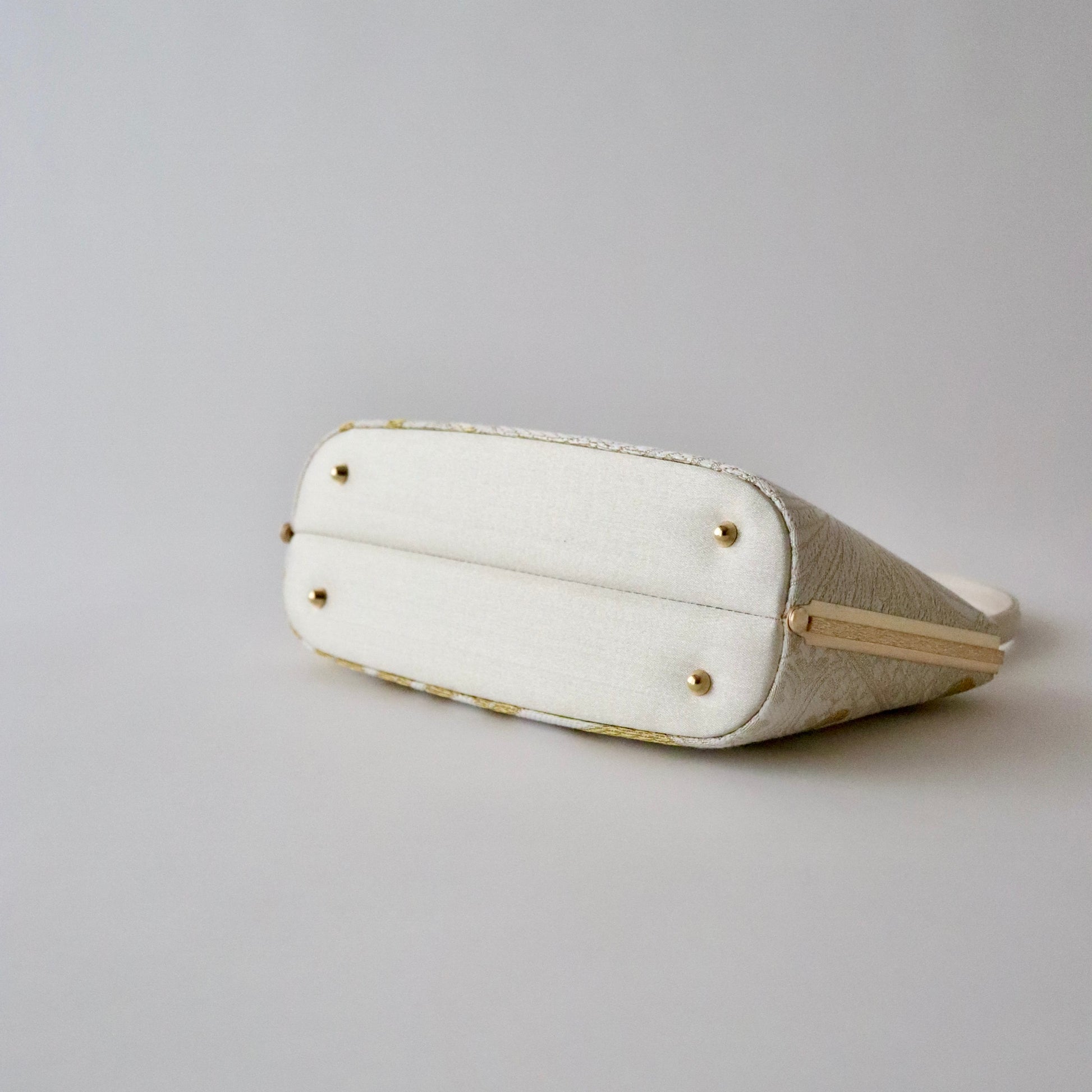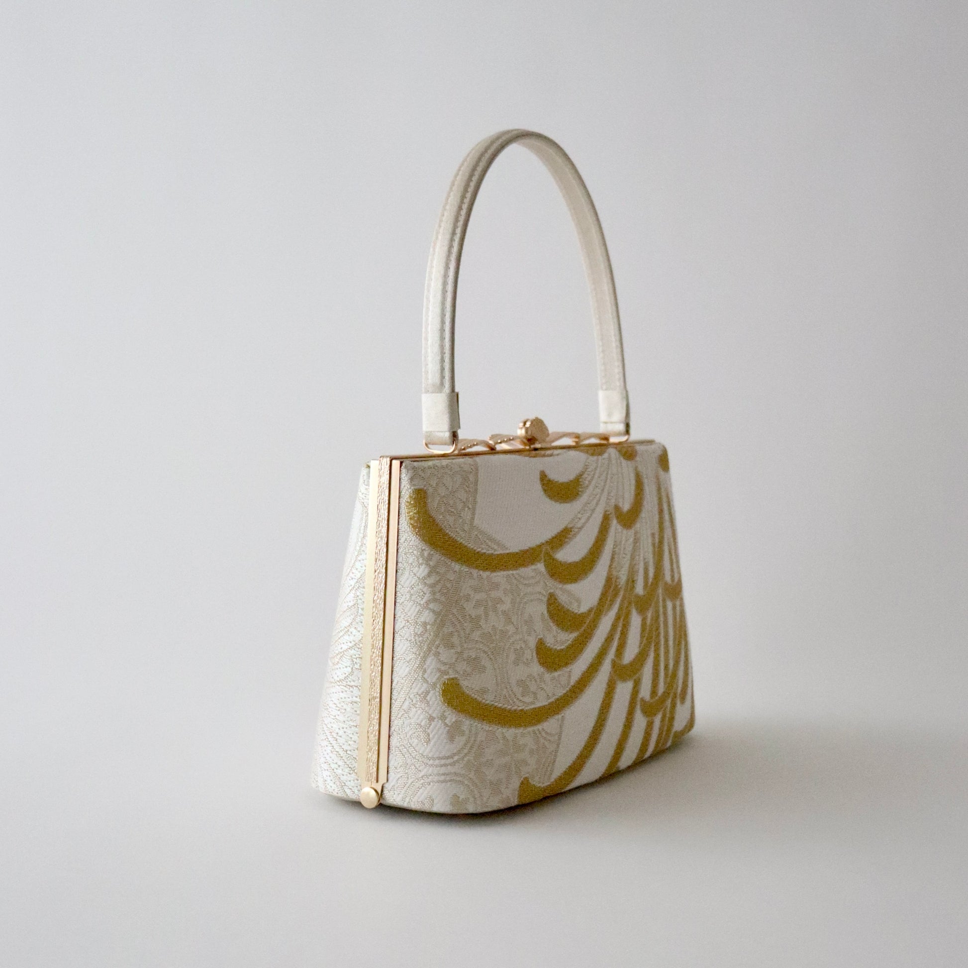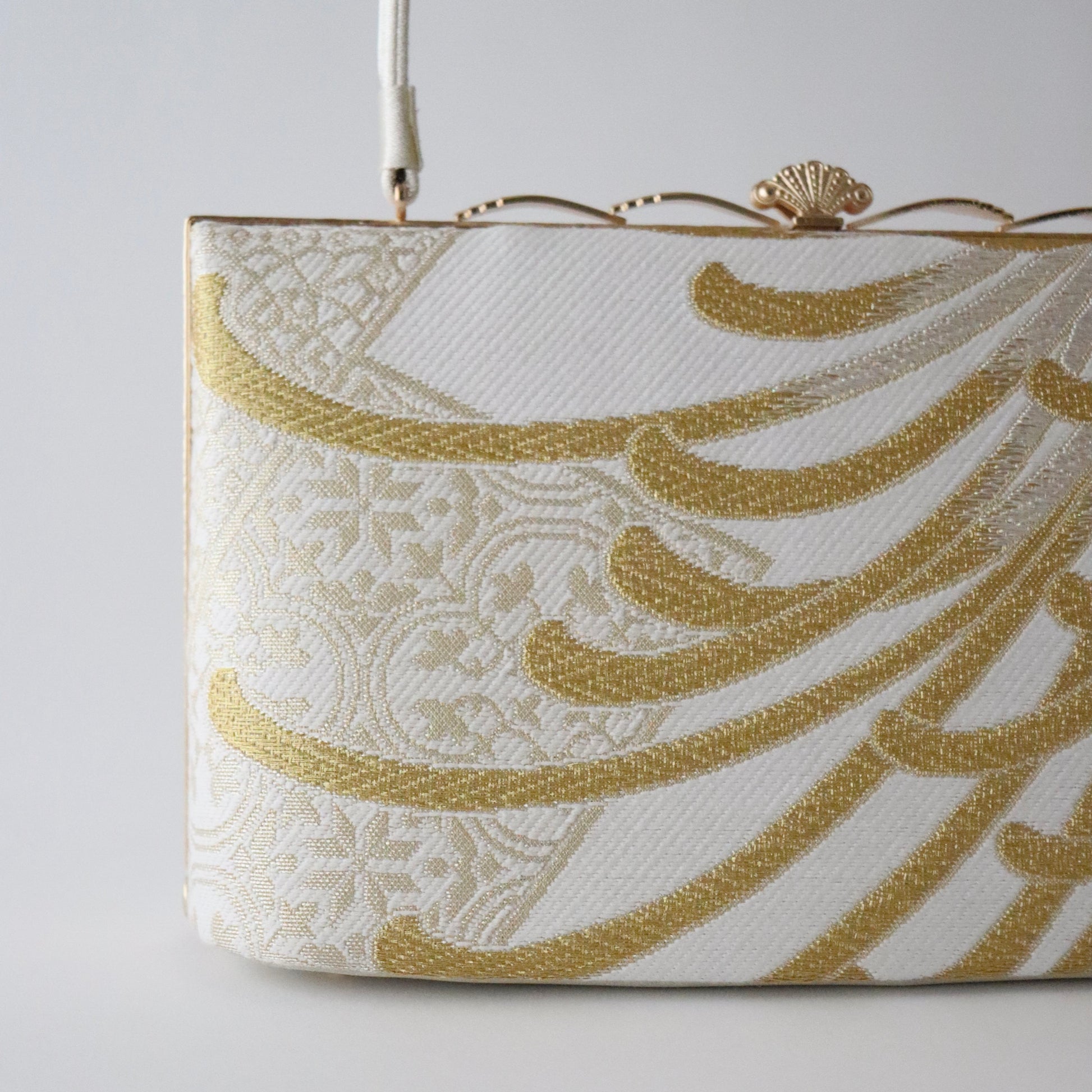 金糸銀糸のコントラストが美しい本作。京都西陣で織り上げた「糸菊」模様の帯地が上品で華やかな仕上がり。真鍮製の留め具の装飾も上品で豪華。慶事の席の装いに相応しいお品物です。