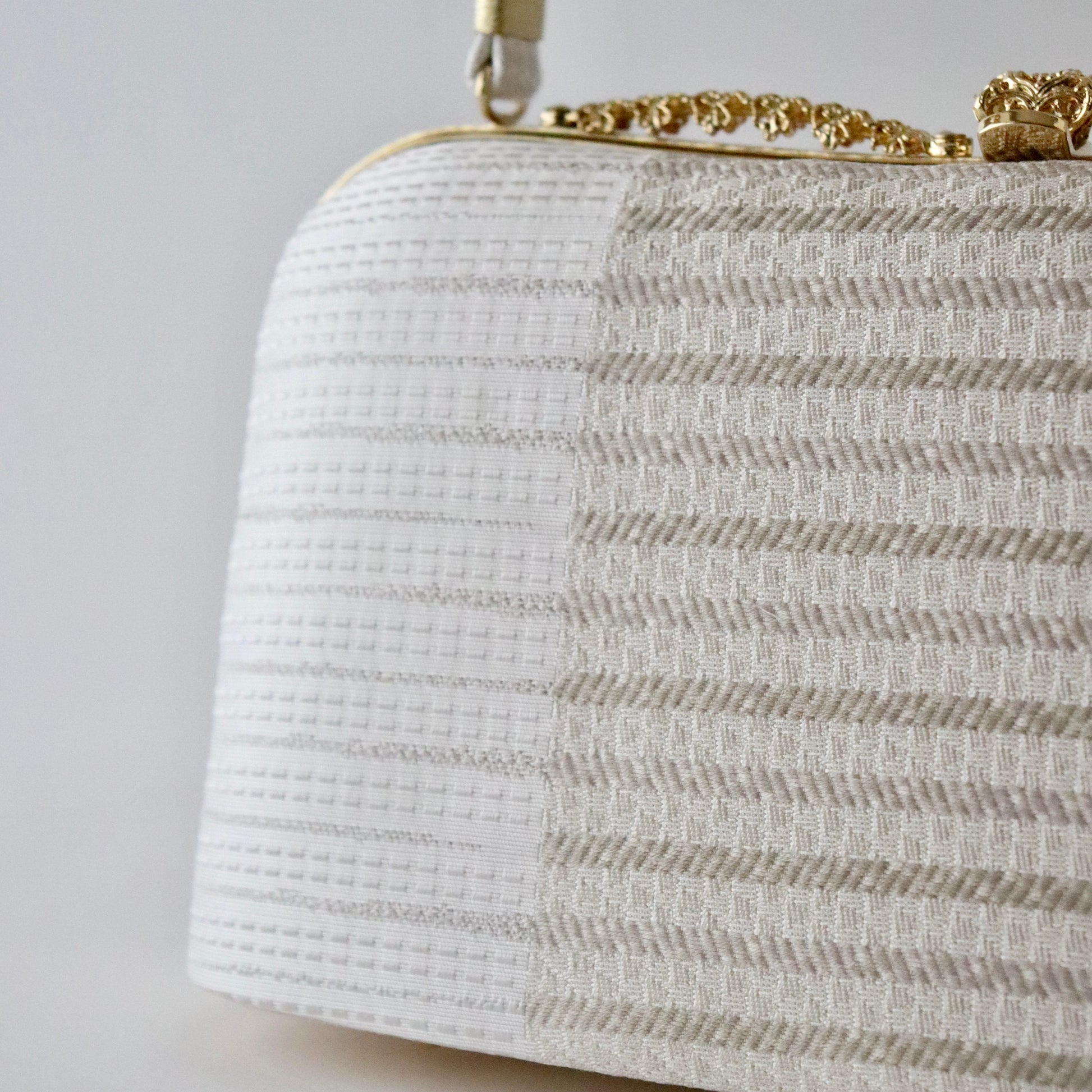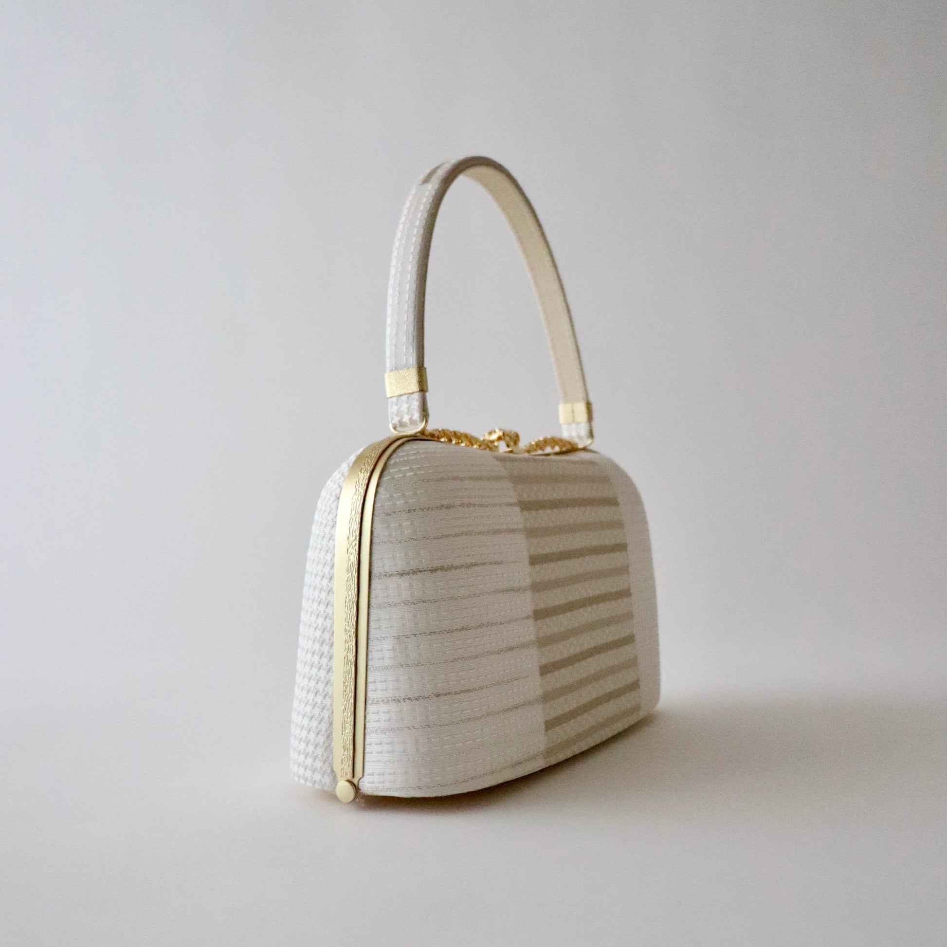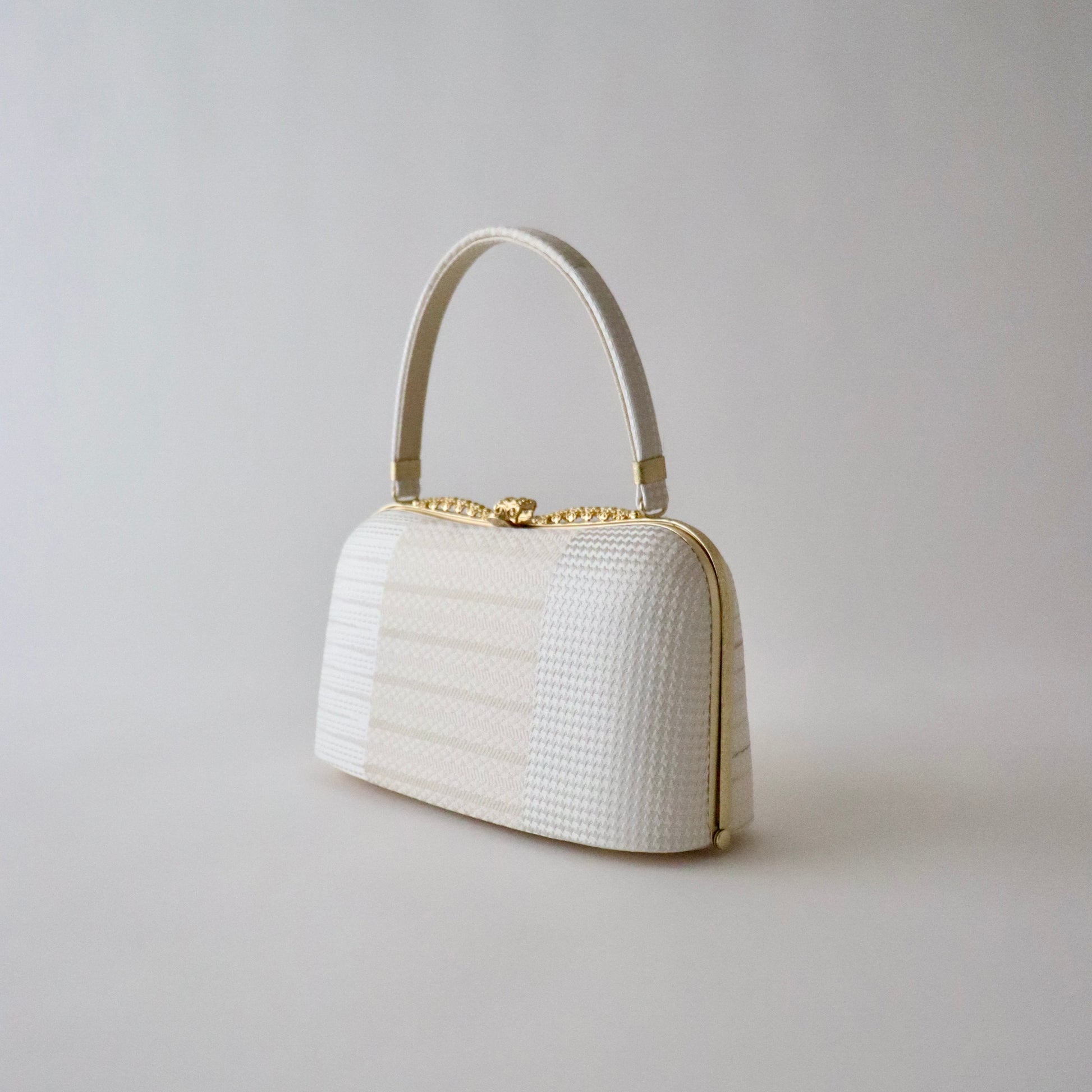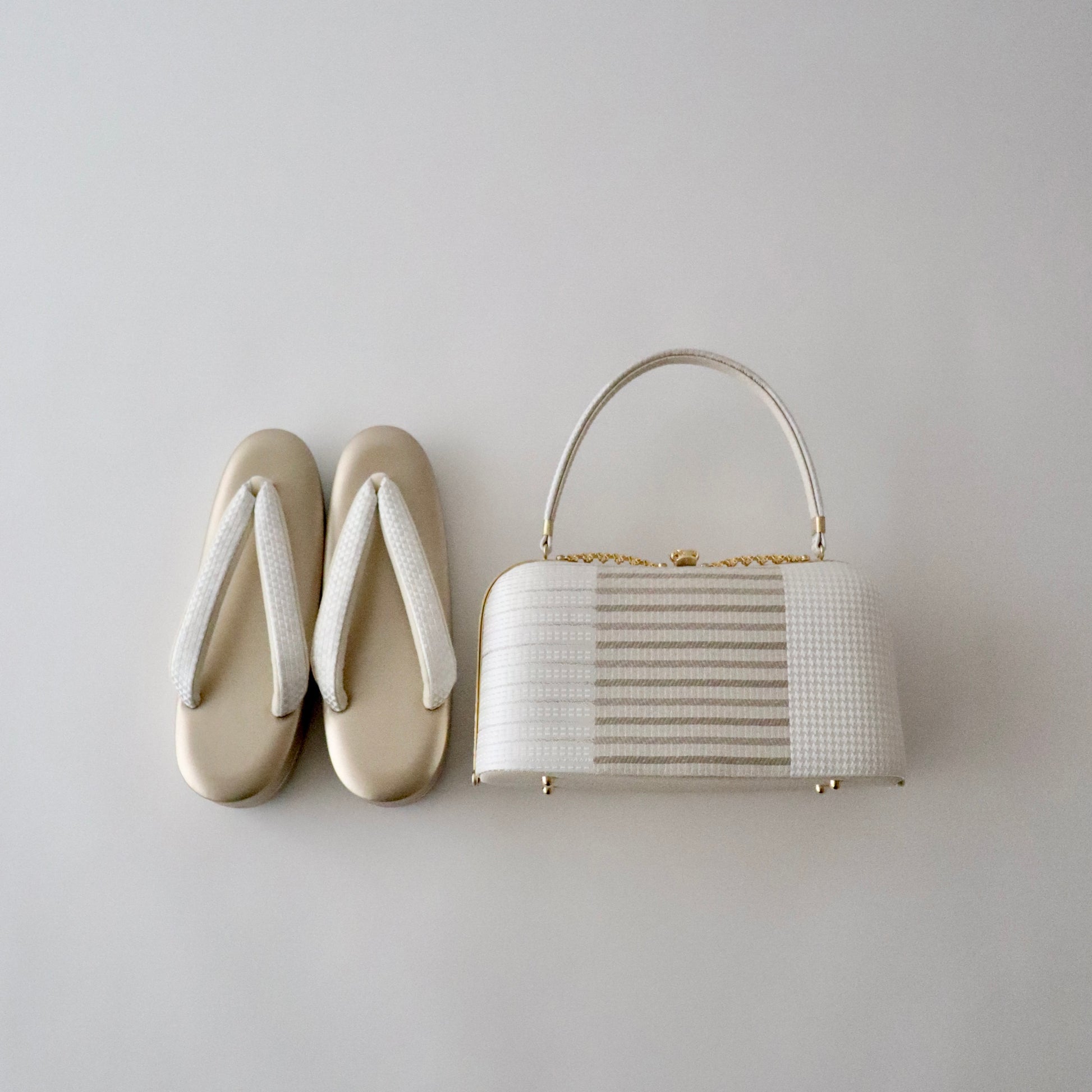 博多織の生地をバッグと鼻緒に用いた本作。博多織ならではの凛と光沢感のある表情がとても美しい仕上がり。器物や草花ではない抽象的な柄意匠なので、礼装にはもちろん少しカジュアルダウンさせたスタイルにもコーディネート頂けます。真鍮の留め具の装飾に至るまでこだわりが行き届いた逸品。慶事の装い、祝賀パーティーなどに相応しいお品物です。