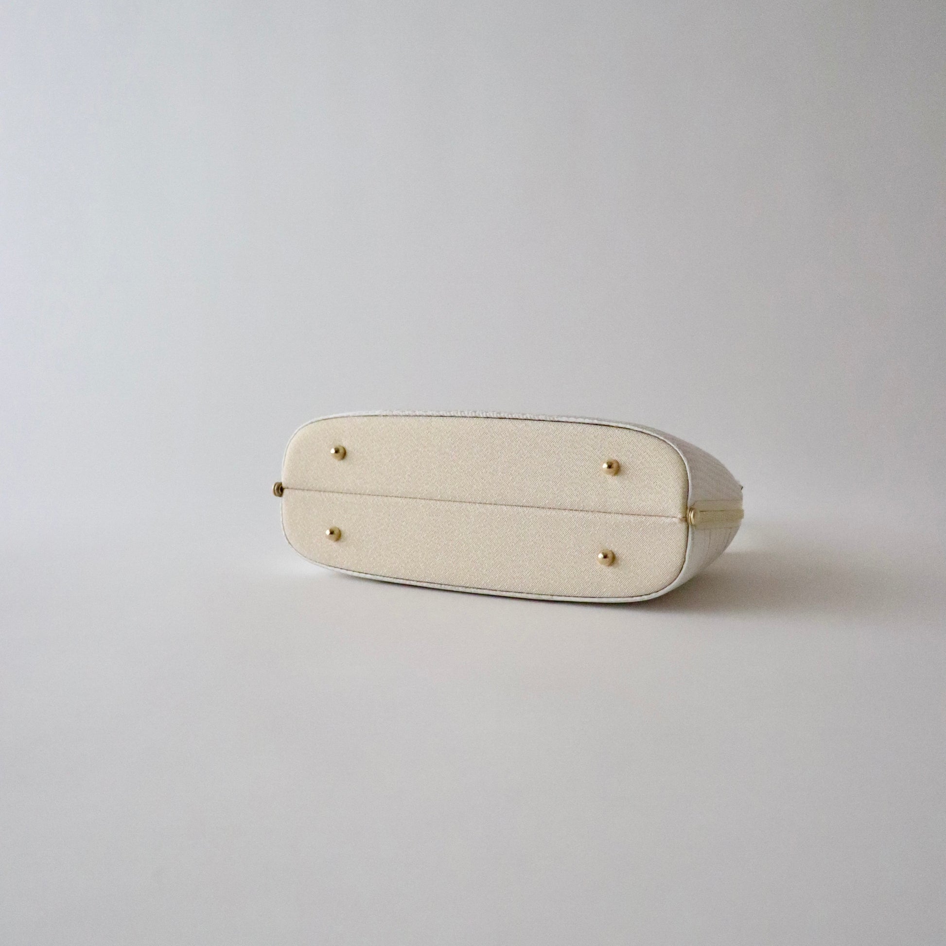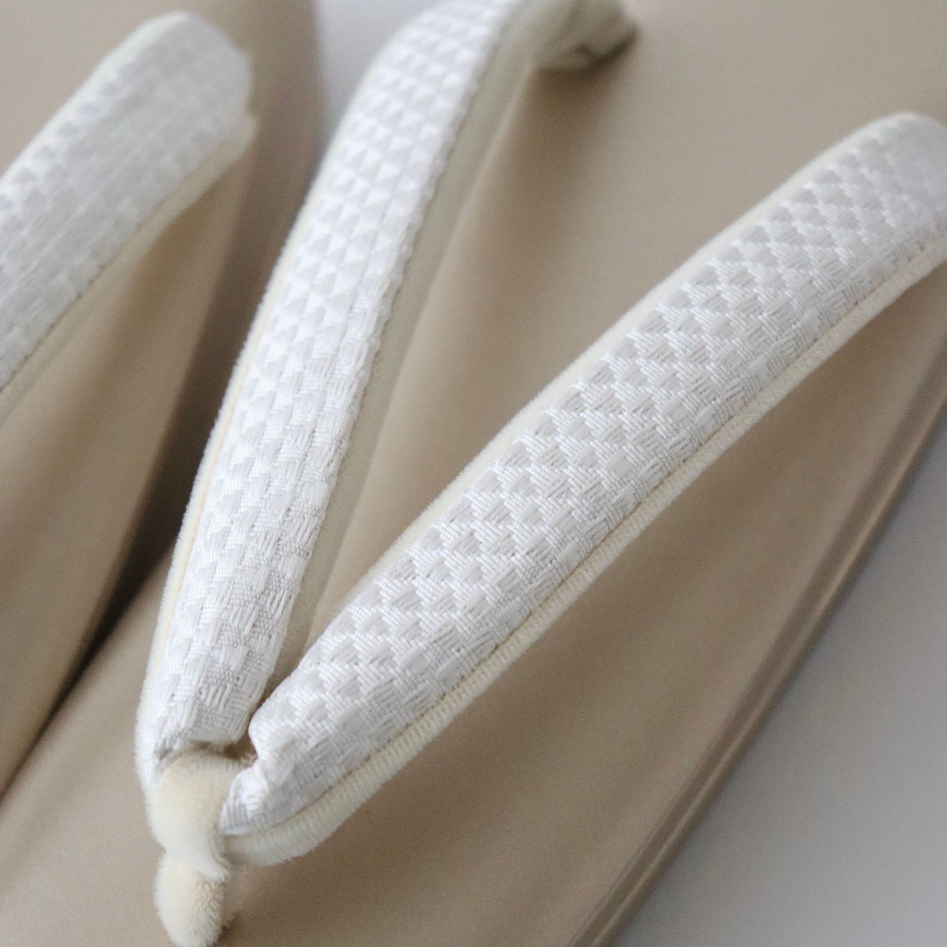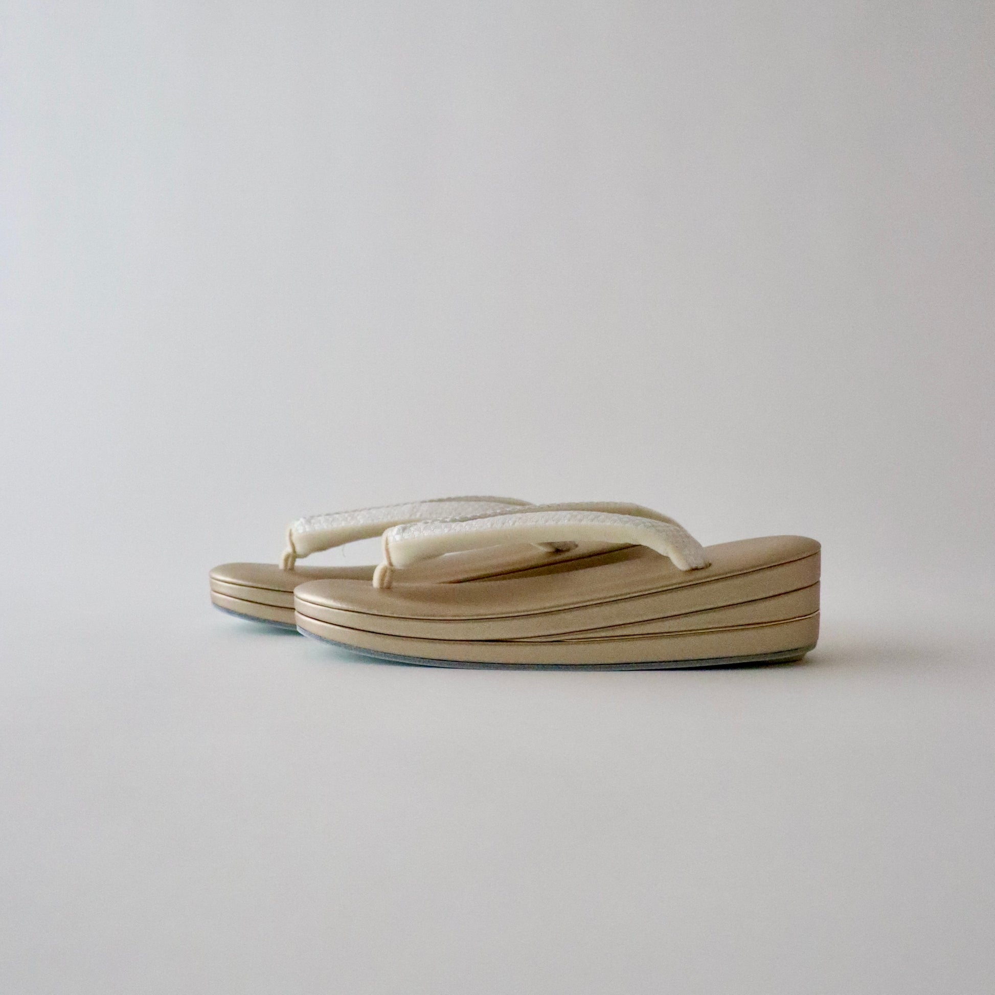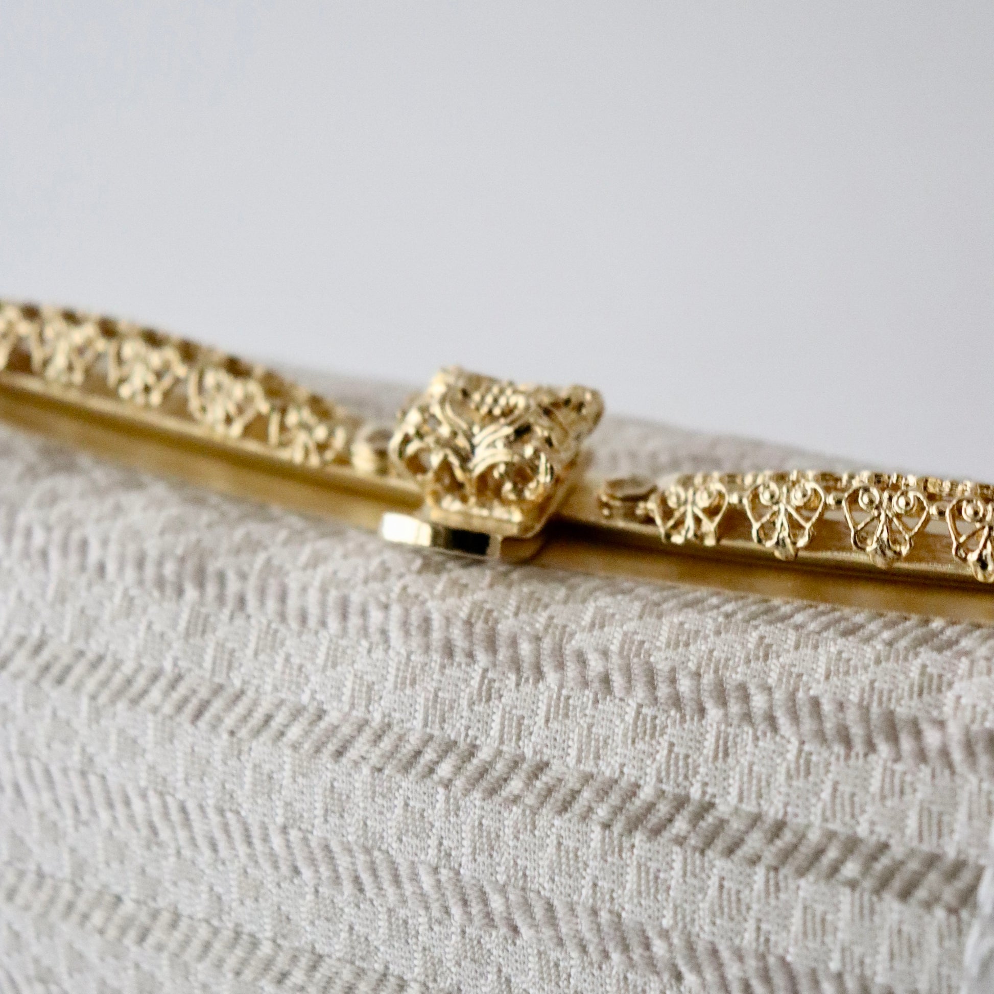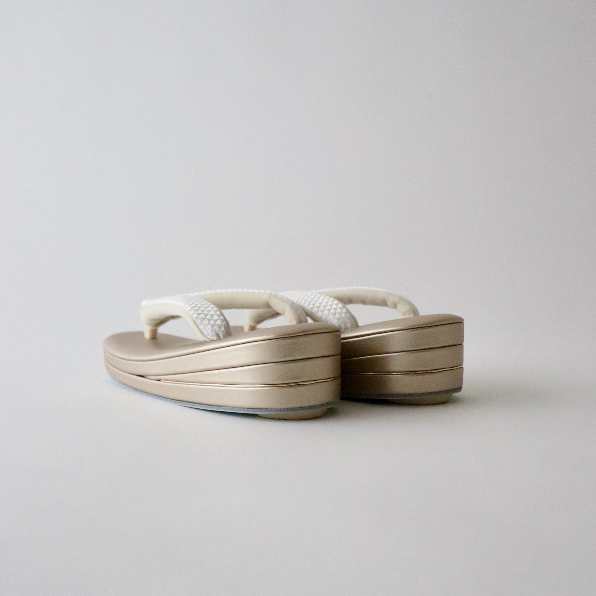 博多織の生地をバッグと鼻緒に用いた本作。博多織ならではの凛と光沢感のある表情がとても美しい仕上がり。器物や草花ではない抽象的な柄意匠なので、礼装にはもちろん少しカジュアルダウンさせたスタイルにもコーディネート頂けます。真鍮の留め具の装飾に至るまでこだわりが行き届いた逸品。慶事の装い、祝賀パーティーなどに相応しいお品物です。