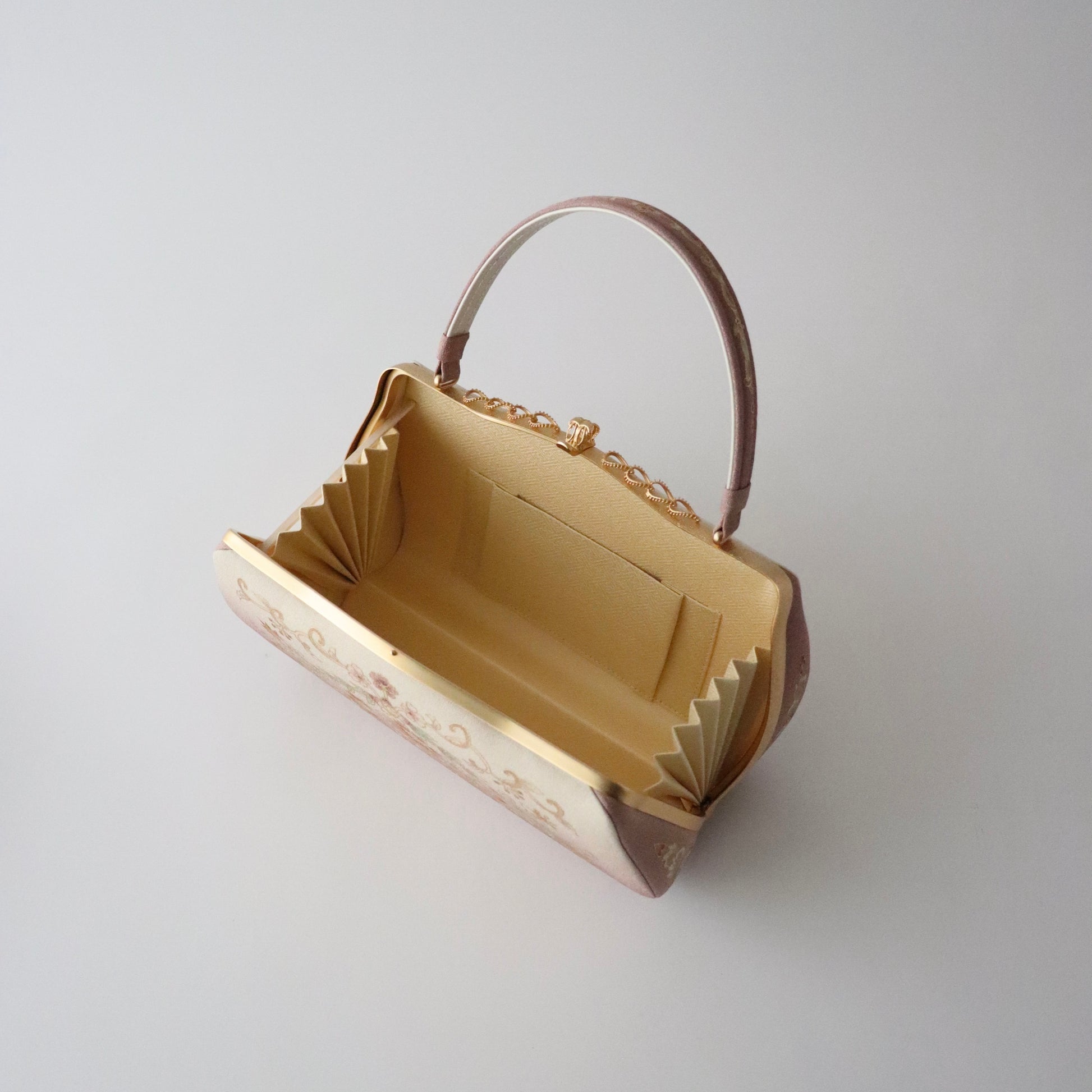独自の感性で友禅を手掛ける「岡重」の魅力を存分にお楽しみ頂ける本作。バッグと鼻緒の為に図案を起こして制作されたその仕上がりは、柄の大きさや色彩に至るまで非常に高い完成度。華やかでありながらも華美になりすぎないその佇まいは「やまざき」と「岡重」の熟練の感性があってこそ。真鍮の留め具の装飾に至るまでこだわりが行き届いた逸品。慶事の装いに相応しいお品物。