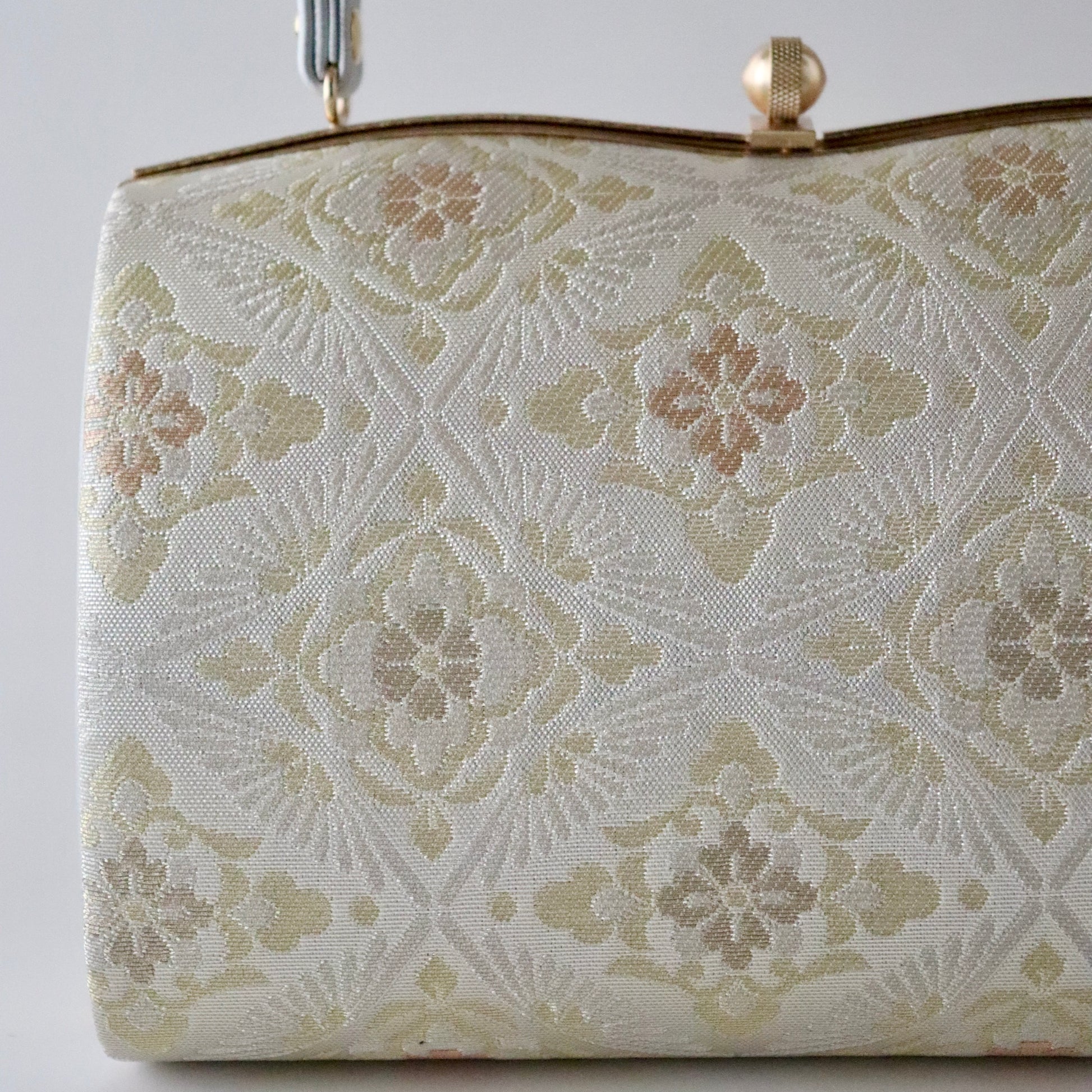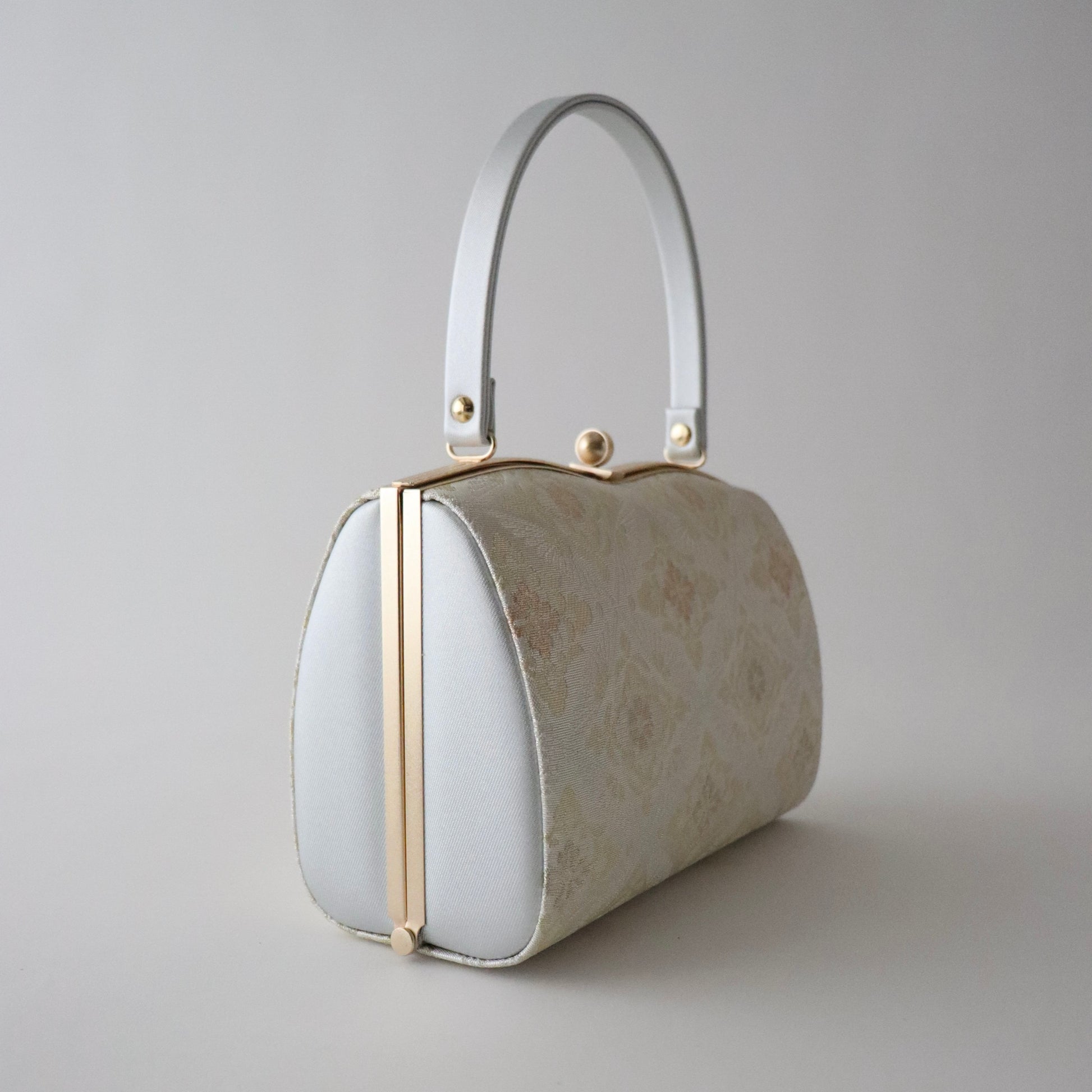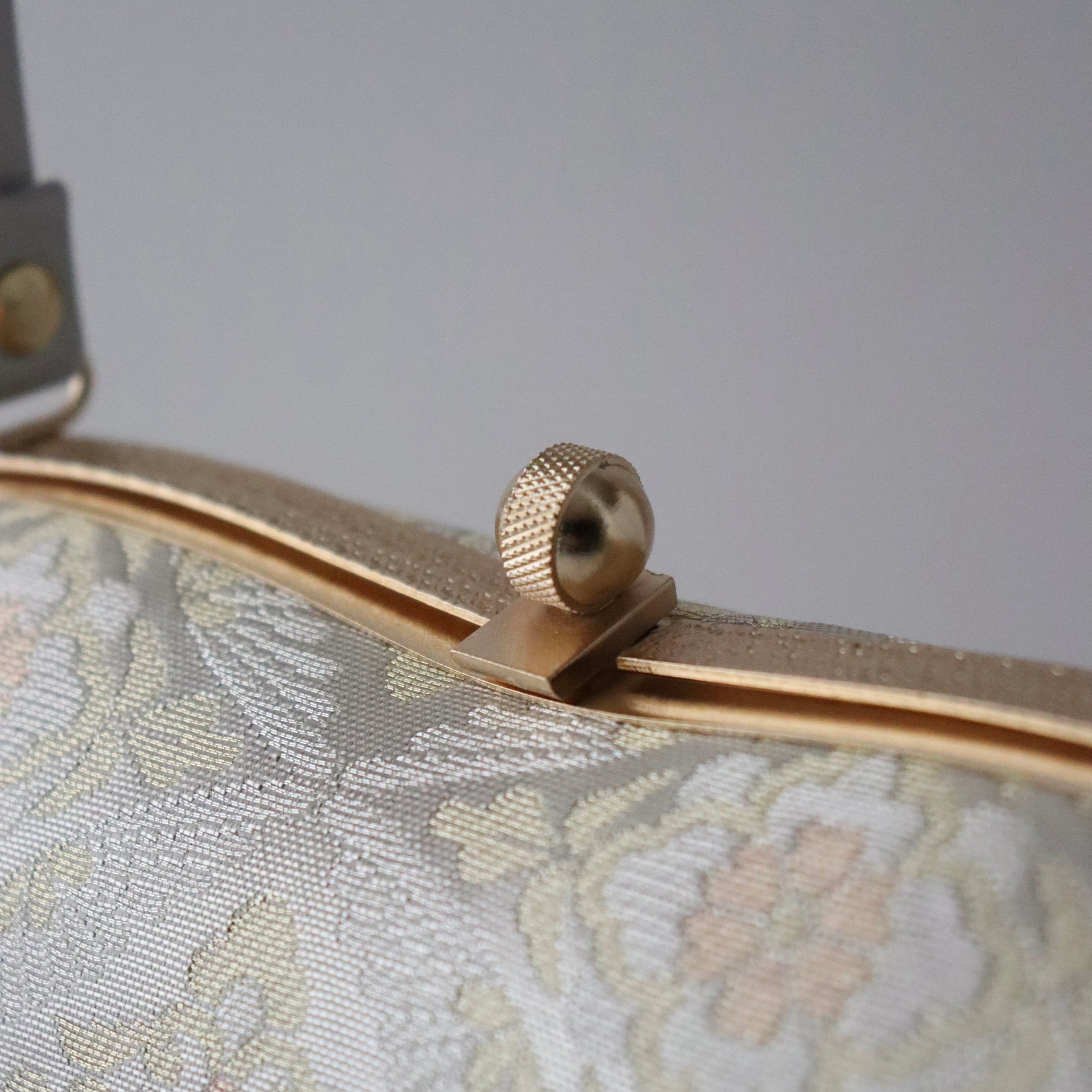丁寧に織り上げられた糸と糸のコントラストが美しい本作。京都西陣で織り上げた「花菱」模様の帯地が上品で華やかな仕上がり。真鍮製の留め具の装飾も上品で豪華。慶事の席の装いに相応しいお品物です。