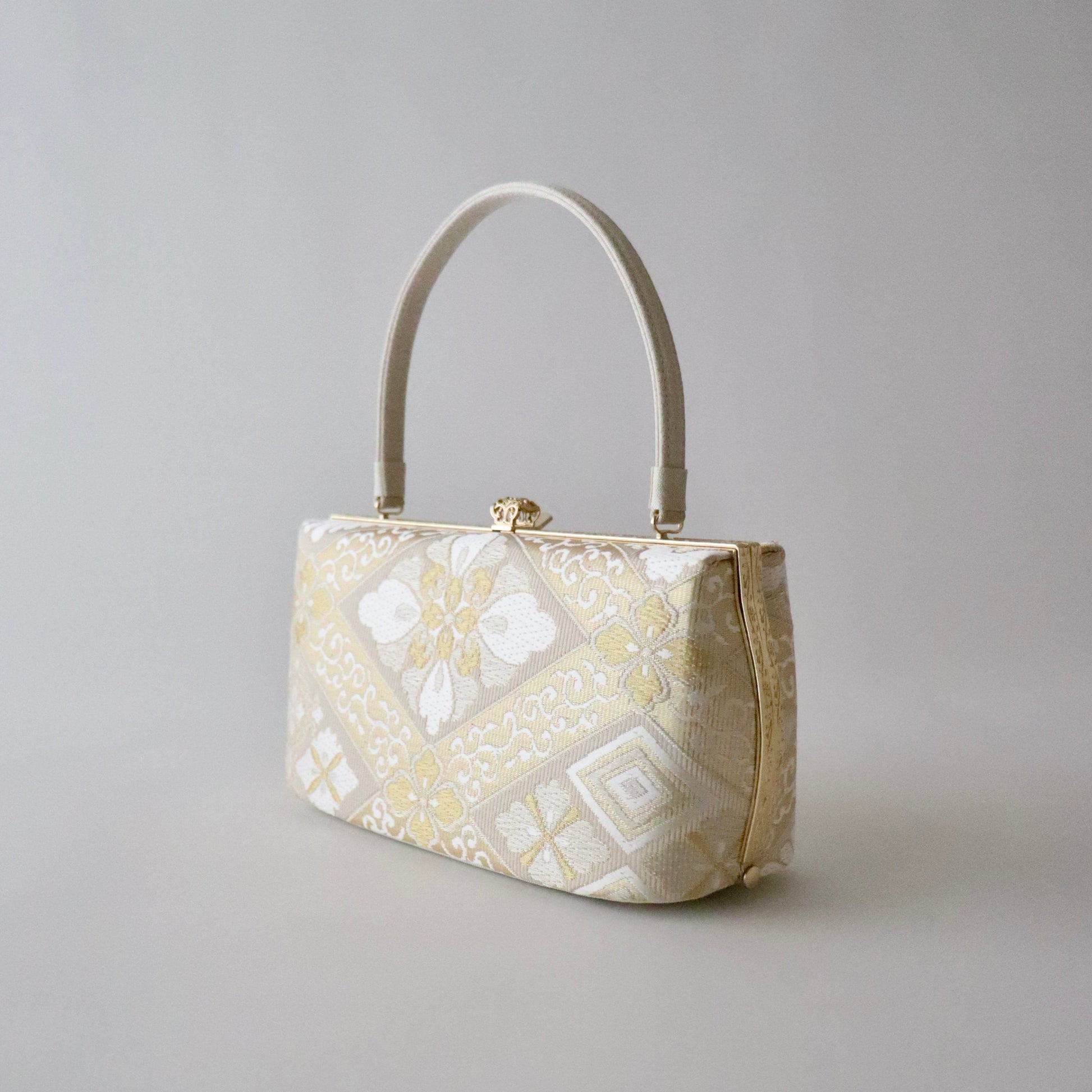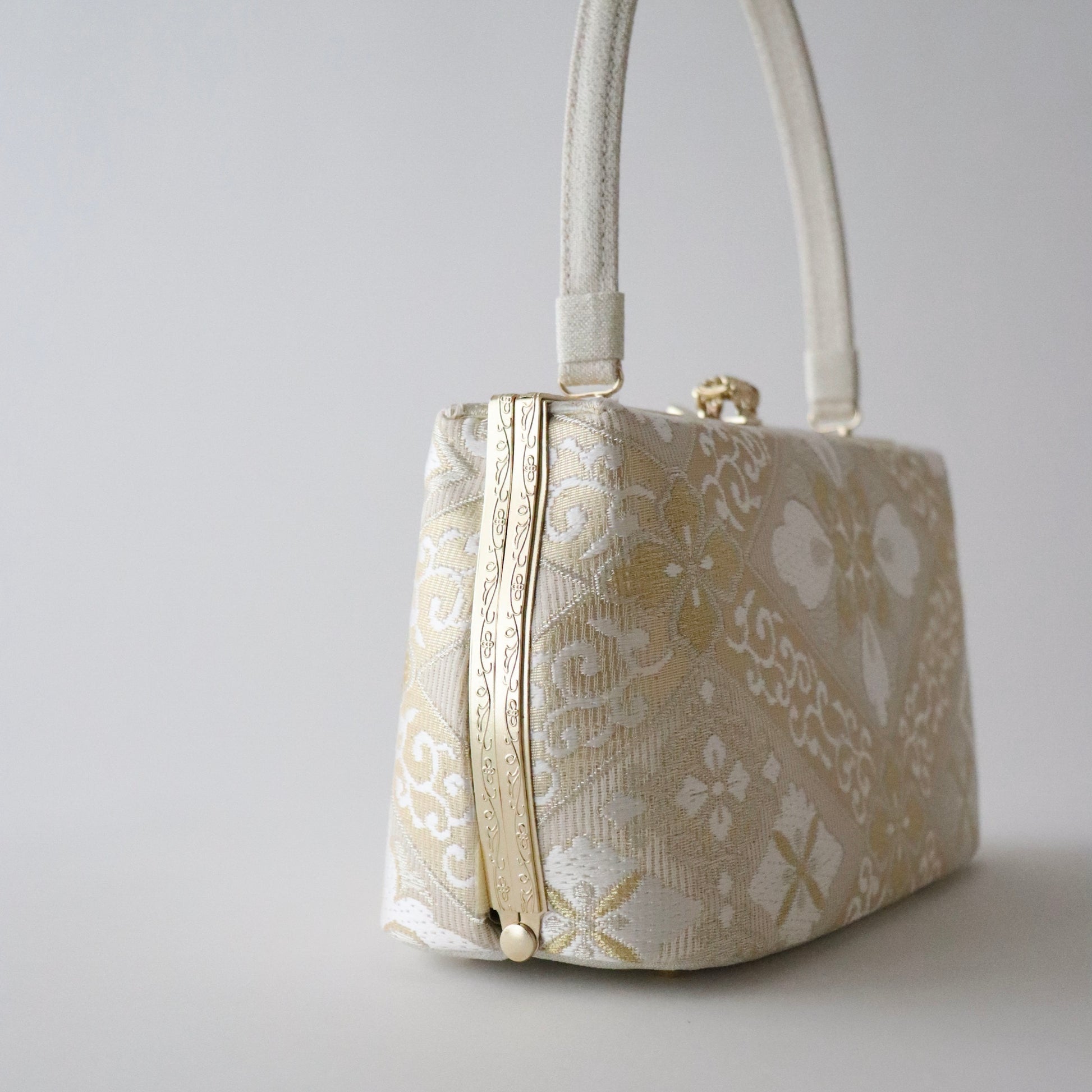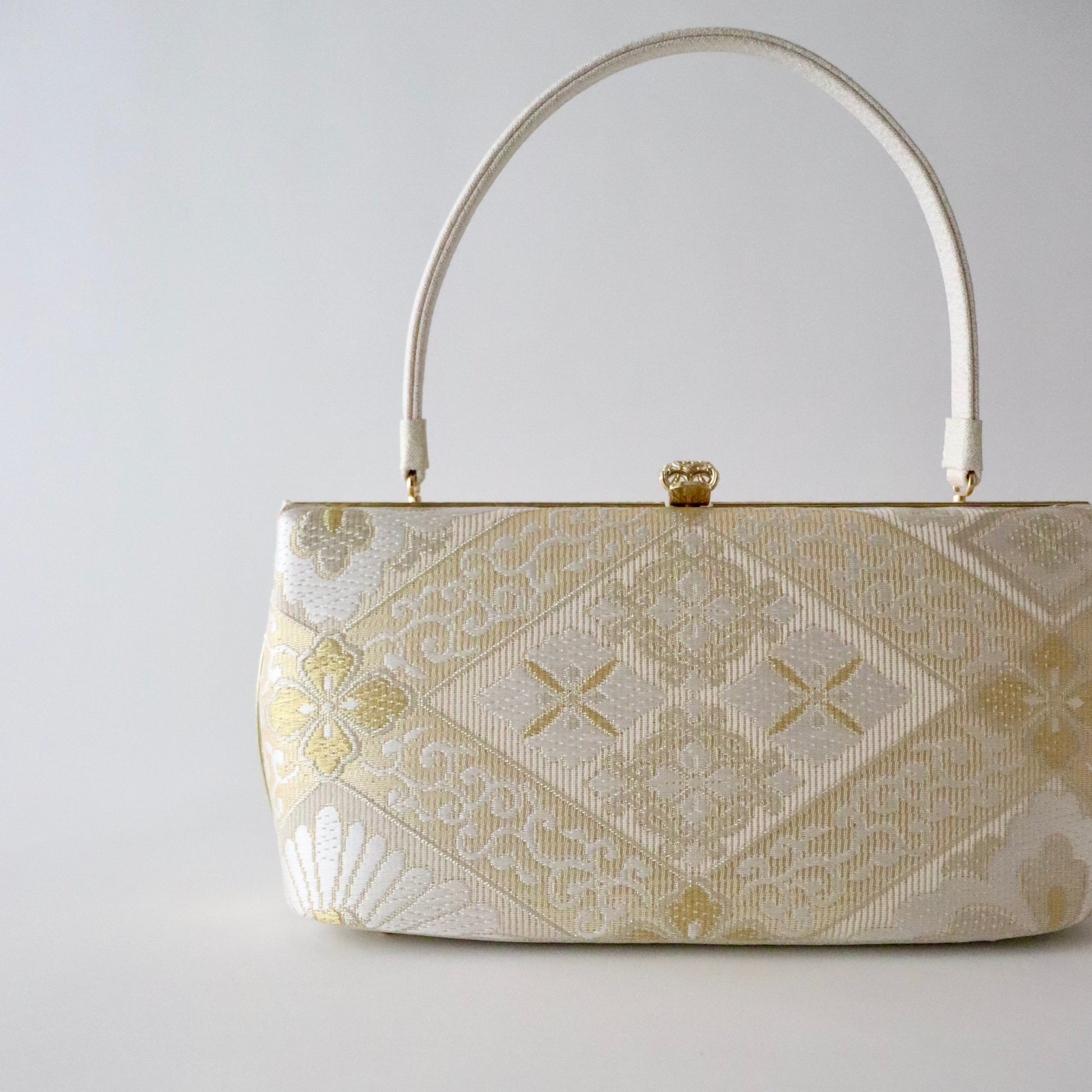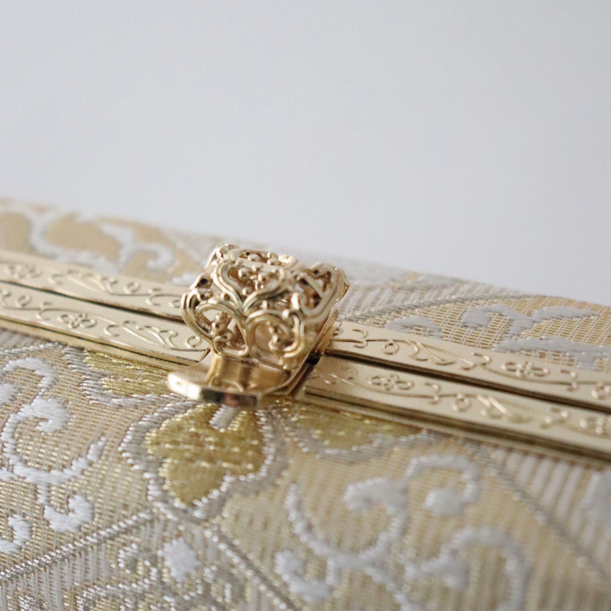 丁寧に織り上げられた糸と糸のコントラストが美しい本作。京都西陣で織り上げた「菱取華文」の帯地が上品で華やかな仕上がり。直線的な意匠が凛とした印書を醸し出す素晴らしい出来栄えです。真鍮製の留め具の装飾も上品で豪華。慶事の席の装いに相応しいお品物です。