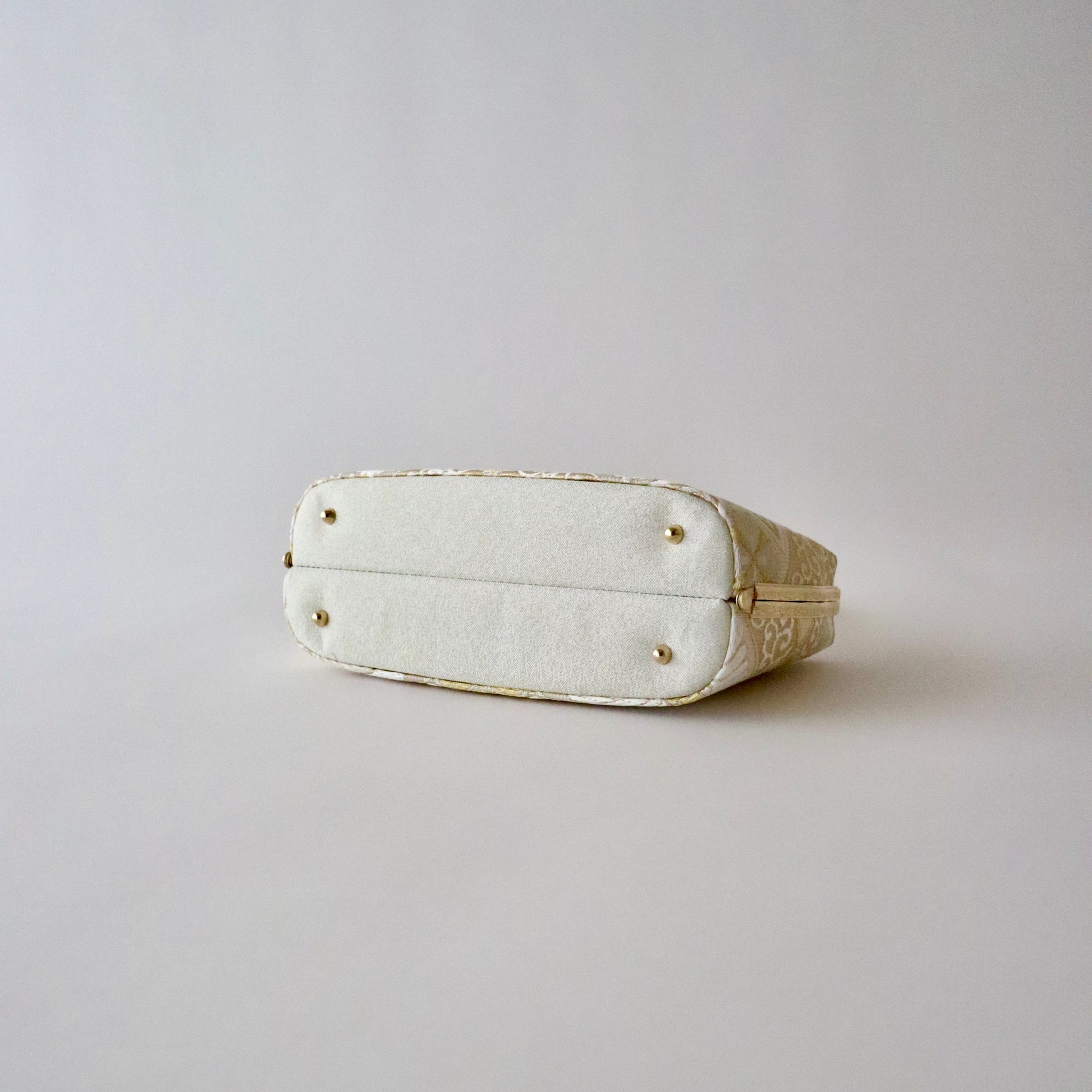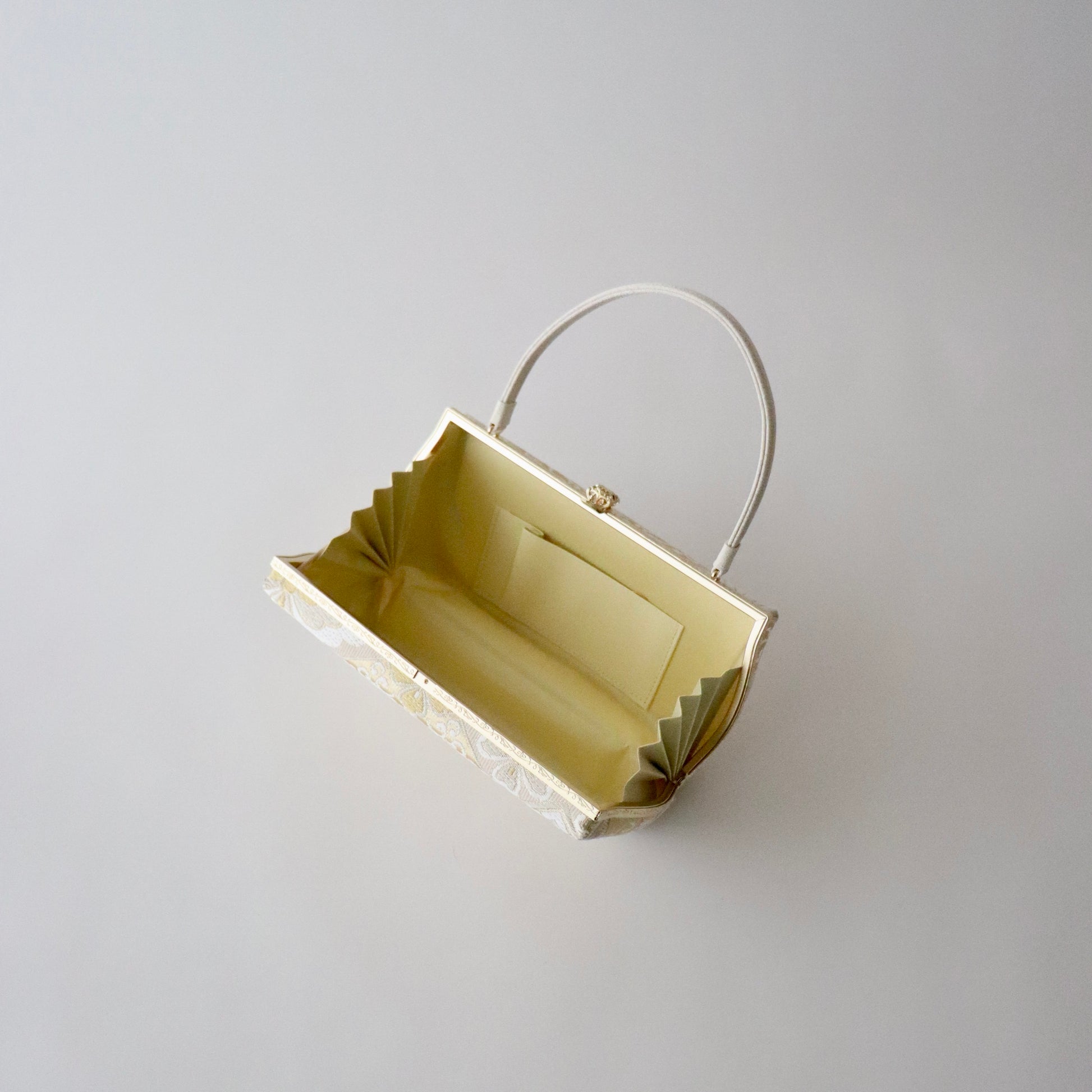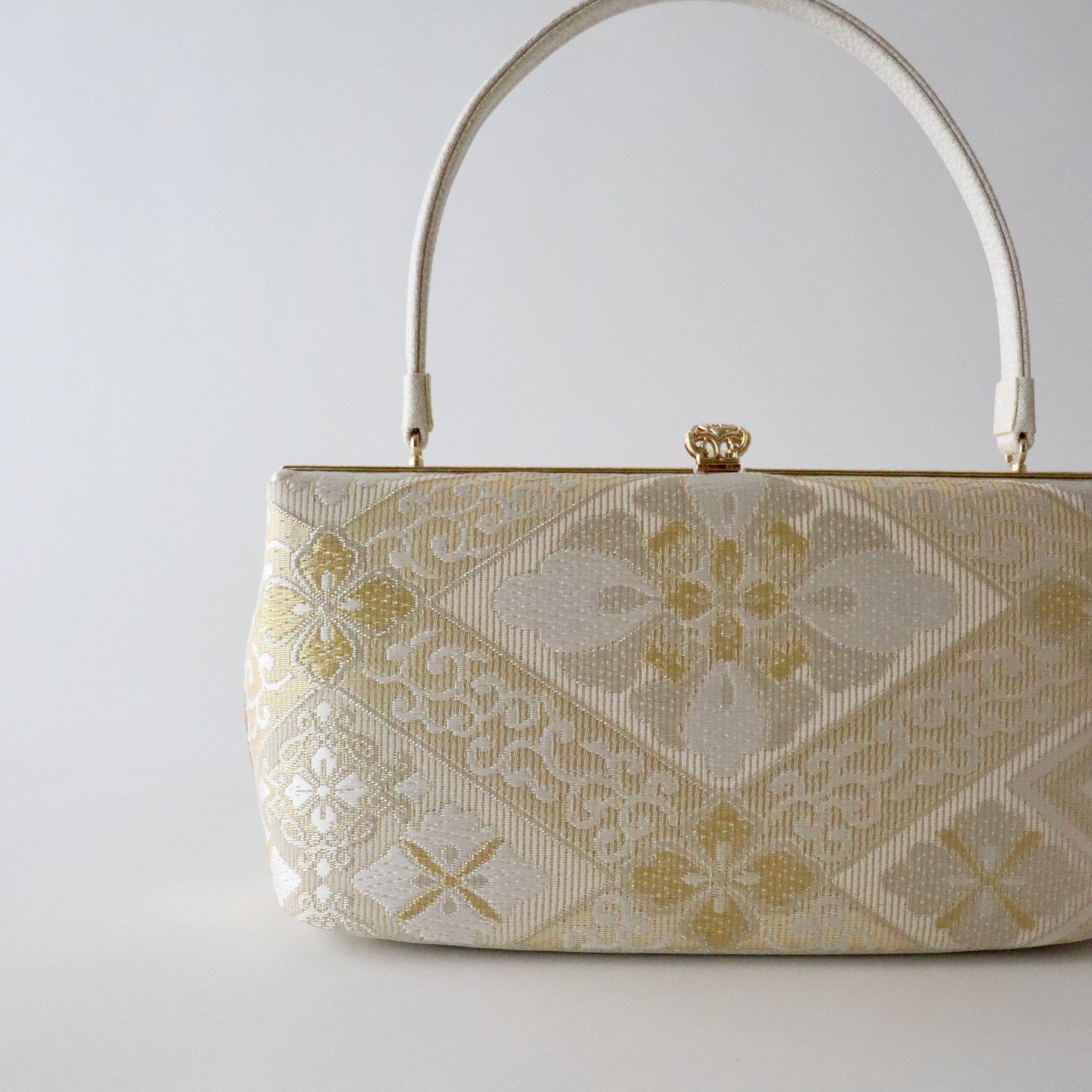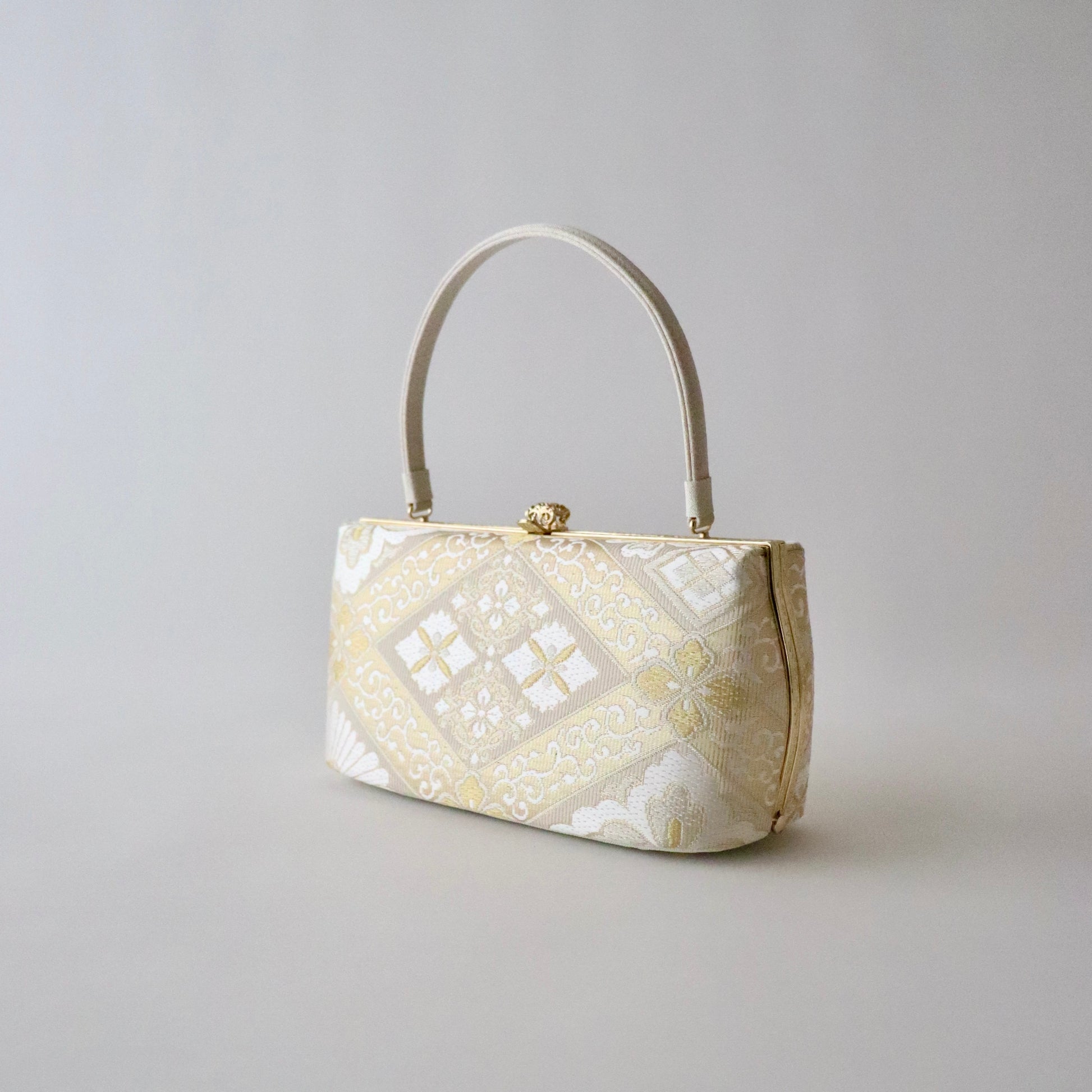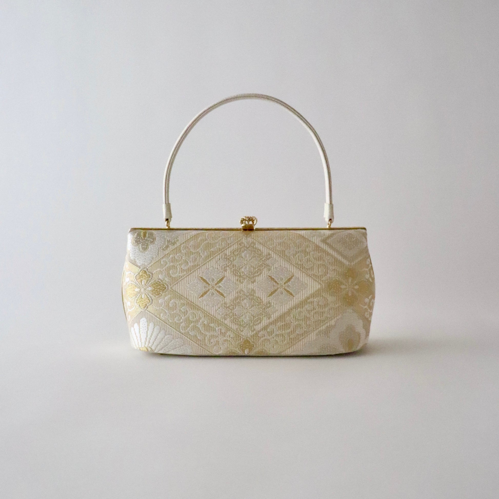 丁寧に織り上げられた糸と糸のコントラストが美しい本作。京都西陣で織り上げた「菱取華文」の帯地が上品で華やかな仕上がり。直線的な意匠が凛とした印書を醸し出す素晴らしい出来栄えです。真鍮製の留め具の装飾も上品で豪華。慶事の席の装いに相応しいお品物です。
