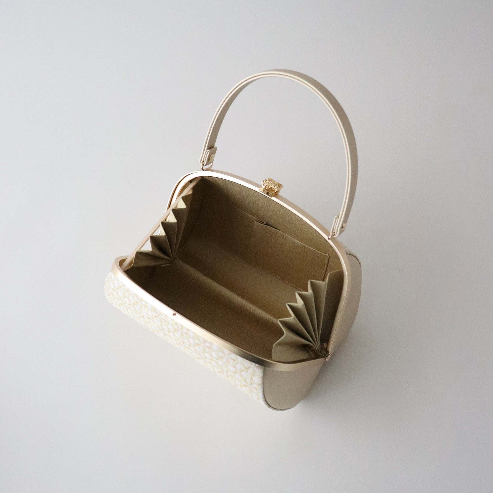金糸銀糸のコントラストが美しい本作。京都西陣で織り上げた「小花」模様の帯地が上品で華やかな仕上がり。正方形を並べたような市松模様に見える洒落た雰囲気も漂う意匠です。真鍮製の留め具の装飾も上品で豪華。慶事の席の装いに相応しいお品物です。
