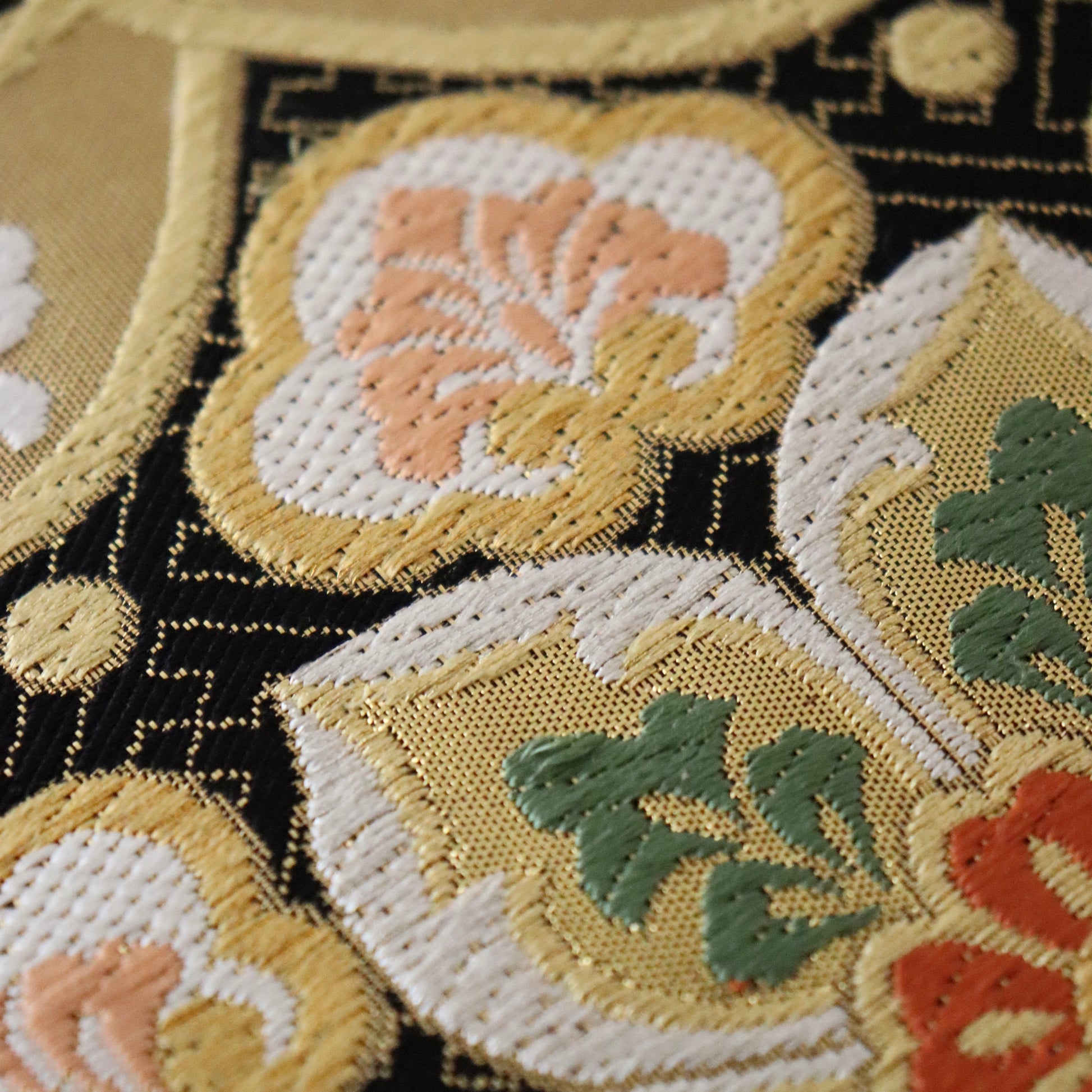 佐賀錦ならではの煌びやかさに唐織ならではの織り表情。上品かつ豪華な仕上がりは振袖向けの帯を得意とする志都香ならでは。文様に込められた吉祥の想いが美事に華やかに振袖コーディネートを彩ります。