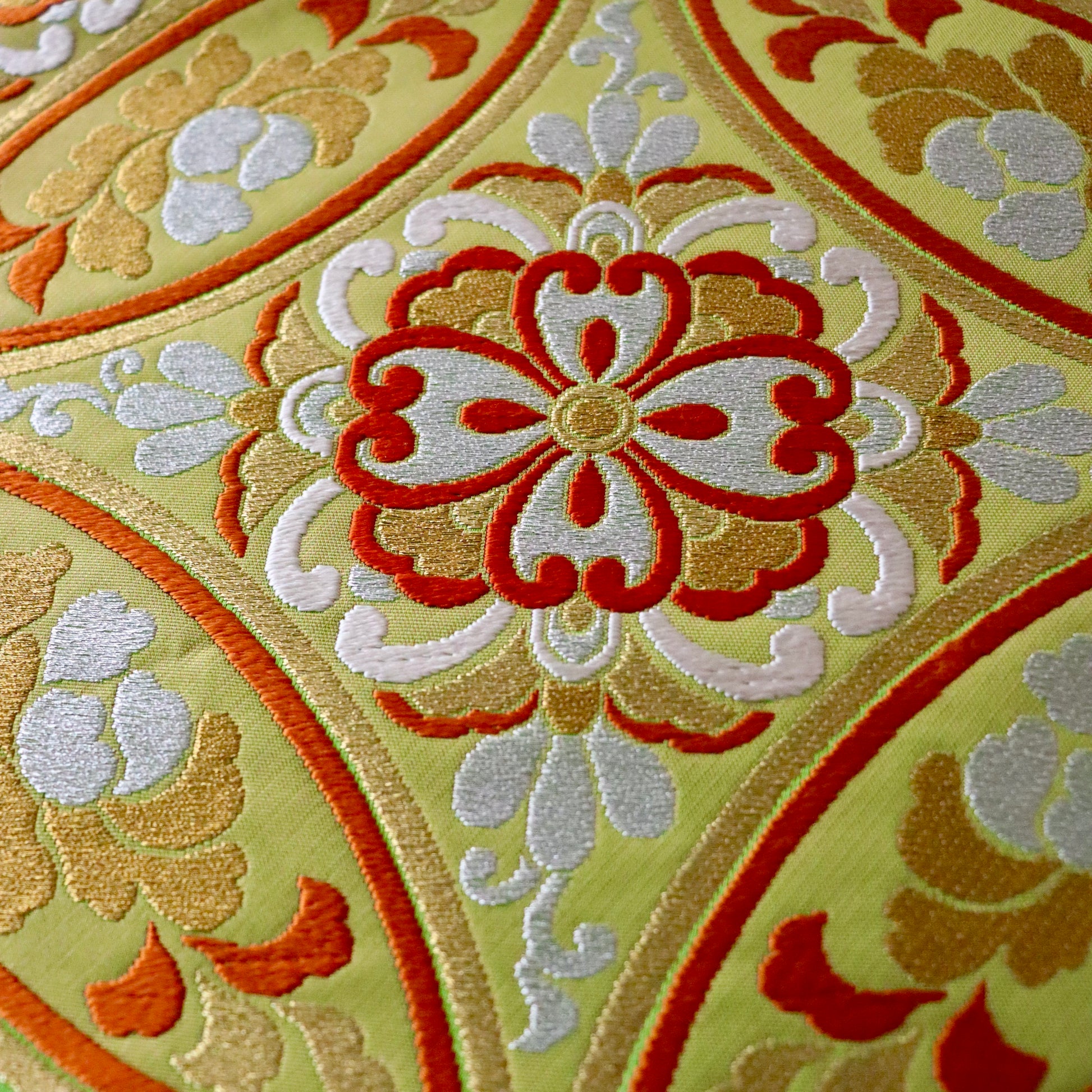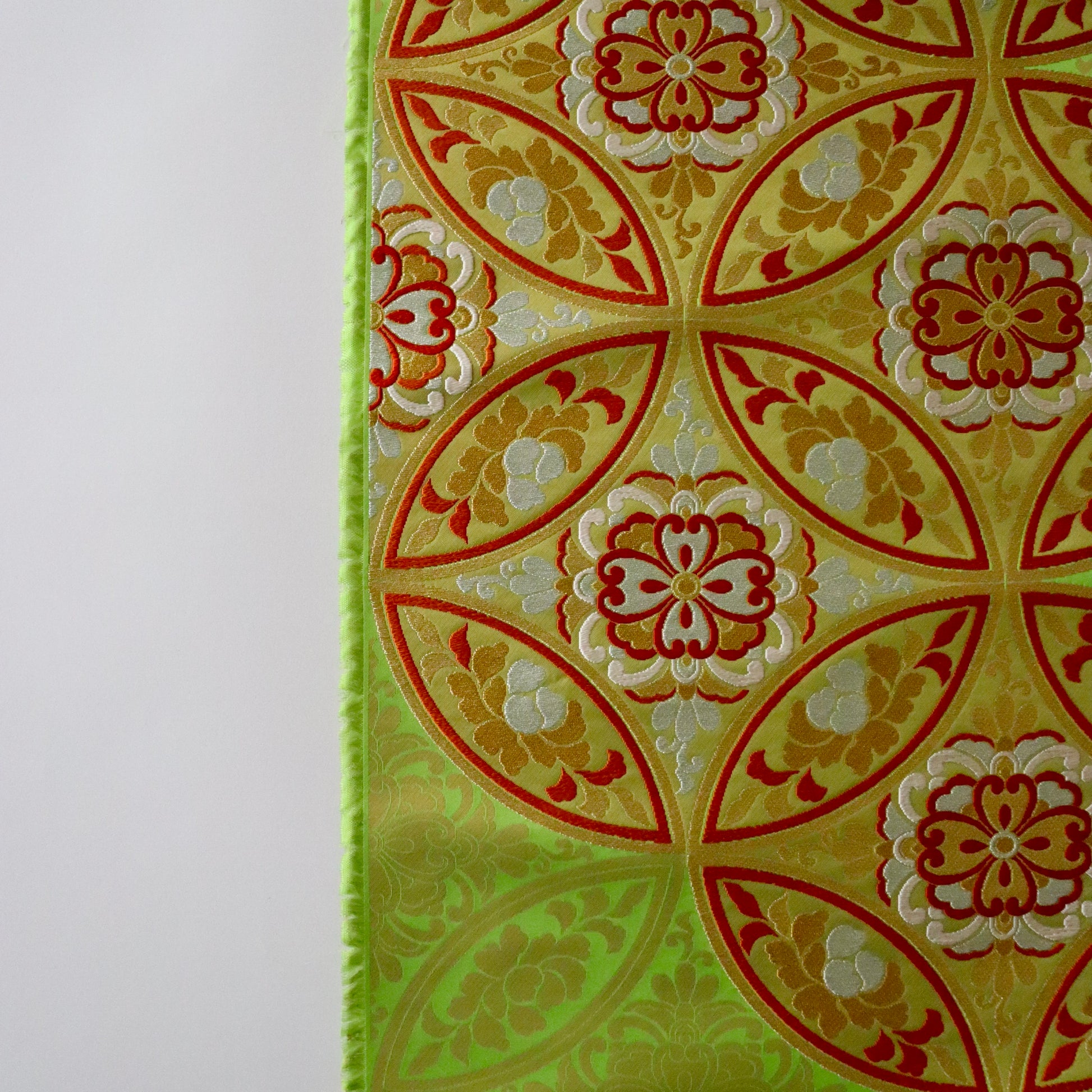 瑞々しく嬉々とした印象の萌黄が実に美しい発色。このようなお色は黒、赤、白との相性が抜群に良いのですが、あまり見かけることがない希少な色。萌黄と朱赤のコントラストが本当に美しい帯です。