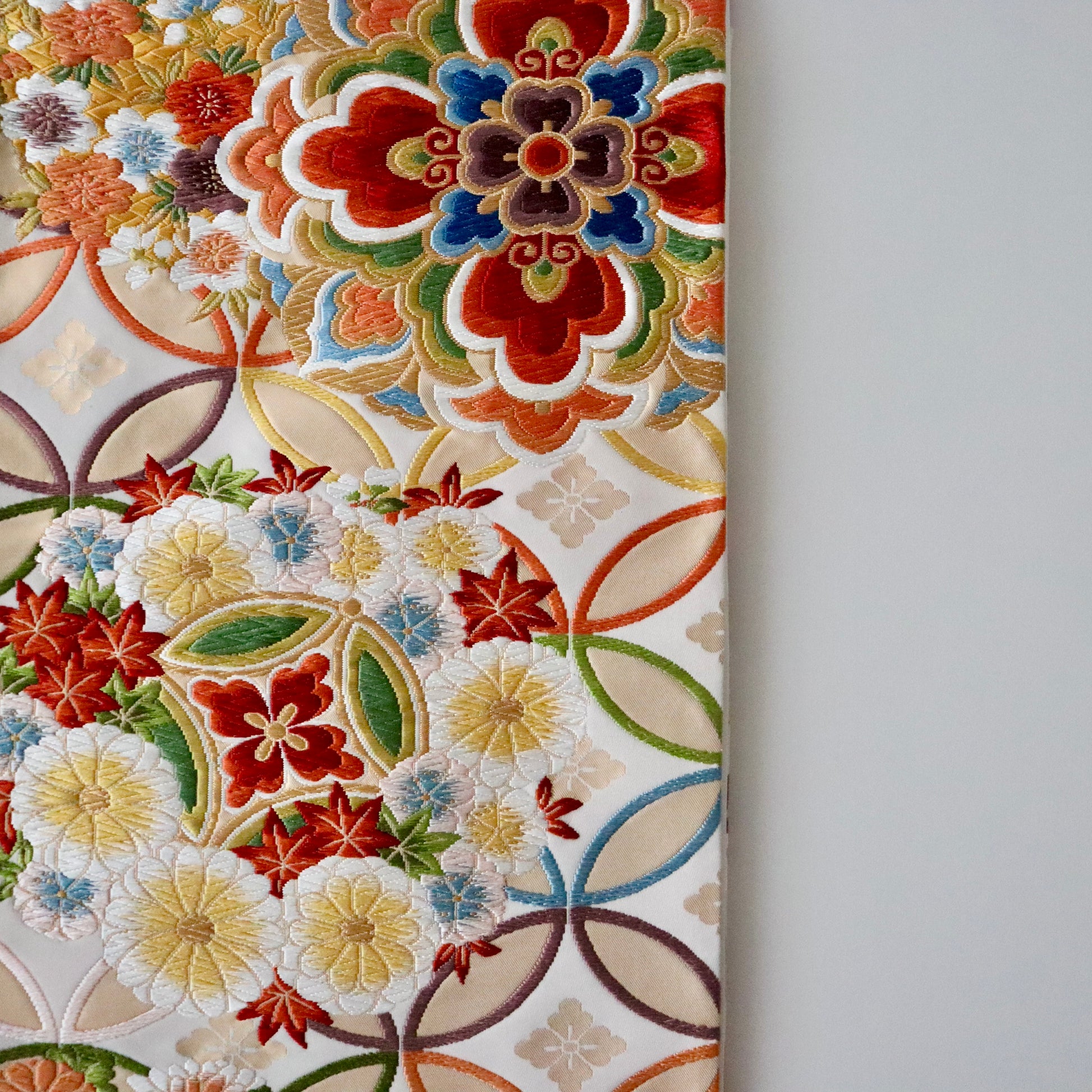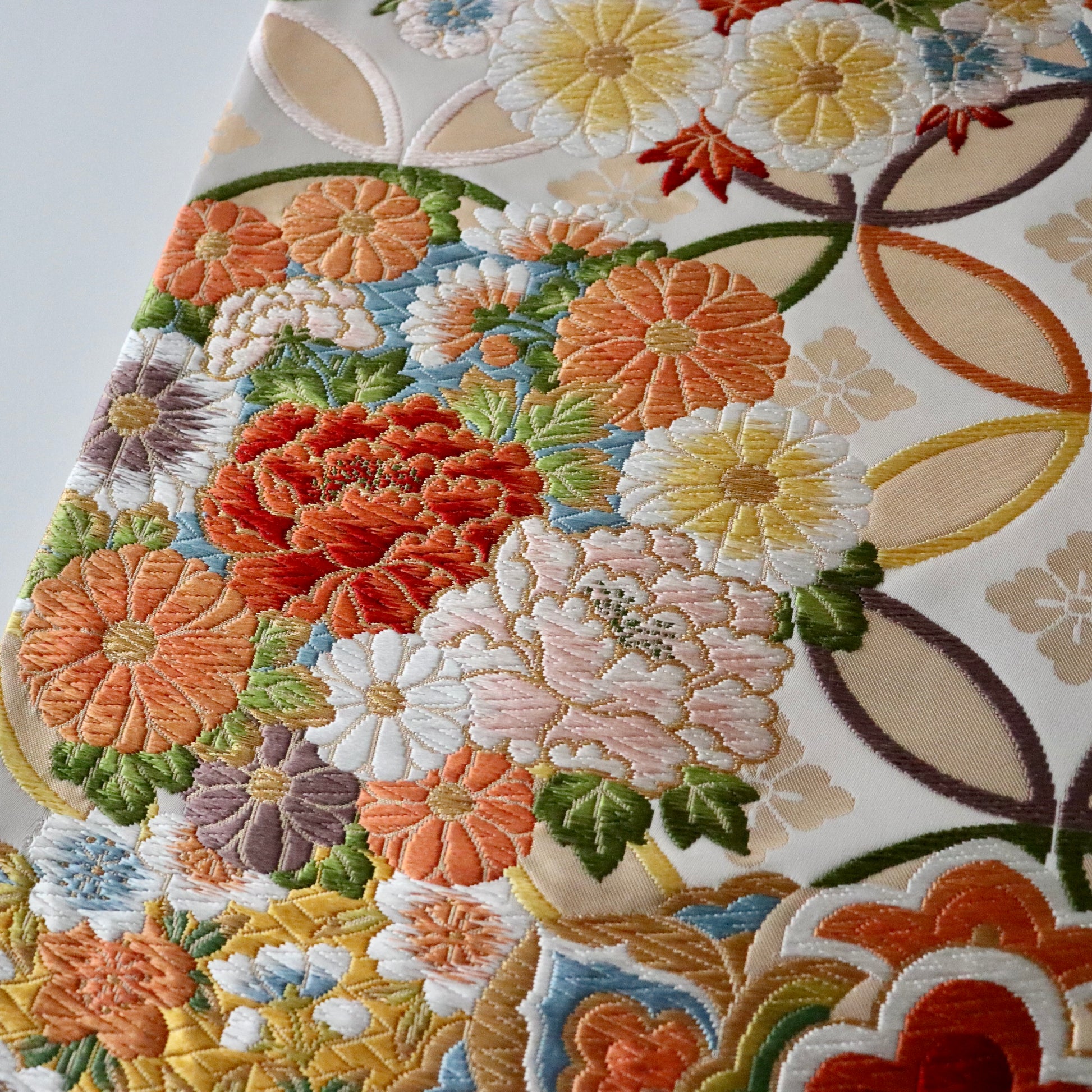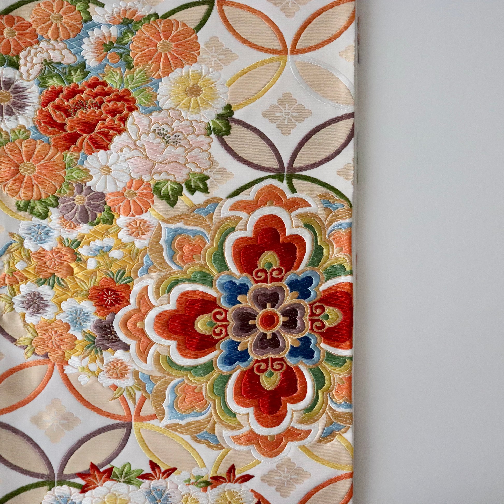 円満や縁の繋がりを表す吉祥文様「七宝文」を基調とし、その上に牡丹、桜、菊といった格調高い花々を配した本作は大きく煌びやかな華文も重ね織り描く事でより一層豪華な仕上がりに。絹糸が織り成す色調と表情は実に美事でさすが名匠「河合美術織物」といった一品です。