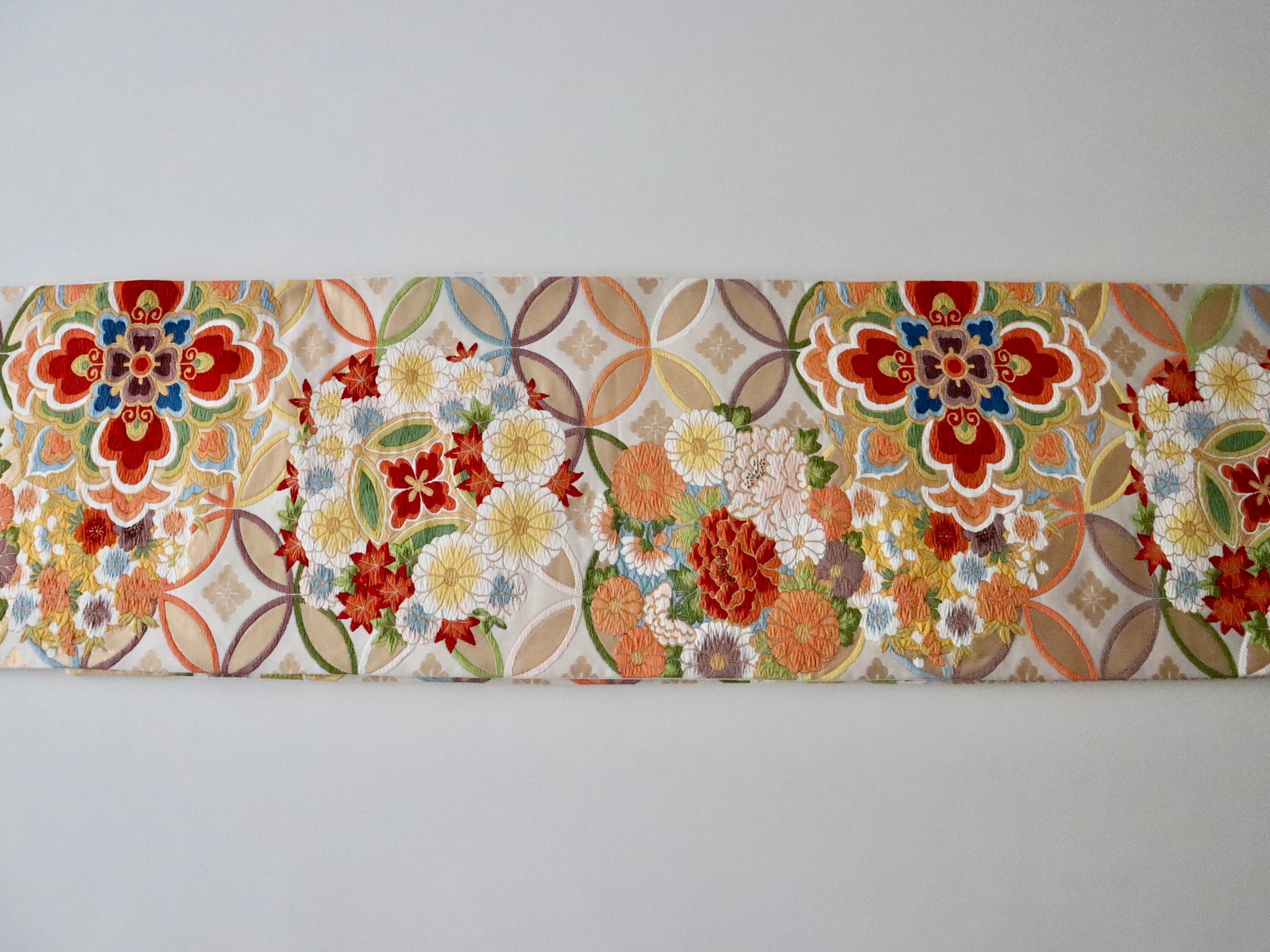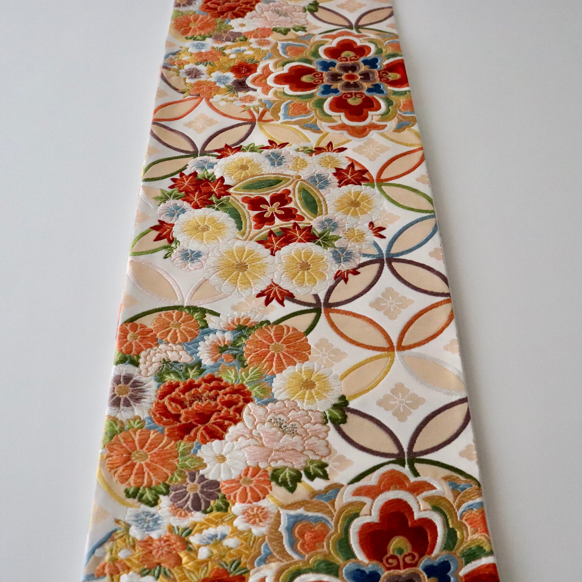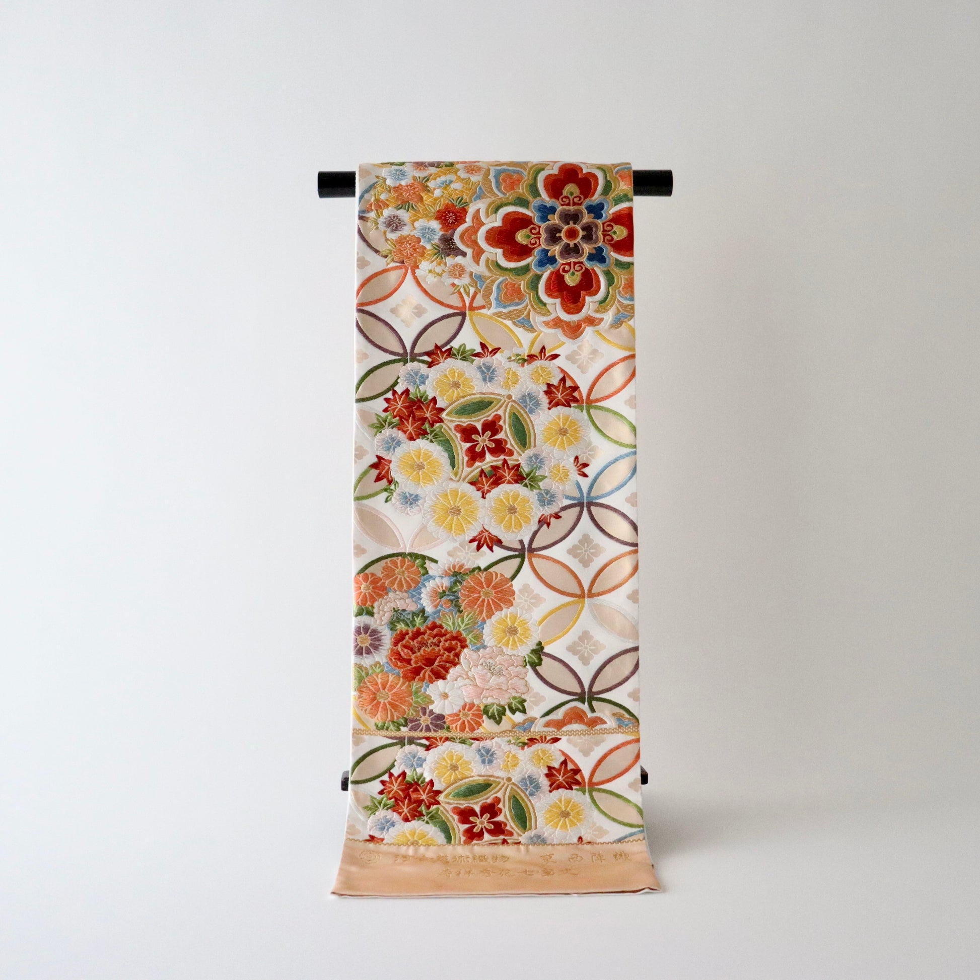 円満や縁の繋がりを表す吉祥文様「七宝文」を基調とし、その上に牡丹、桜、菊といった格調高い花々を配した本作は大きく煌びやかな華文も重ね織り描く事でより一層豪華な仕上がりに。絹糸が織り成す色調と表情は実に美事でさすが名匠「河合美術織物」といった一品です。