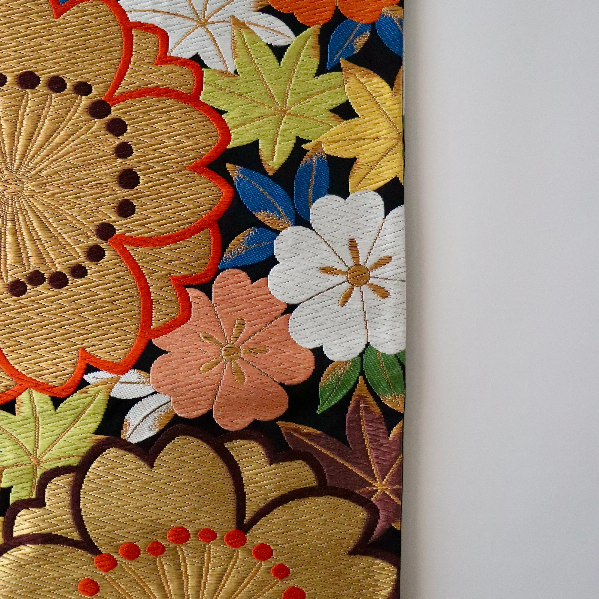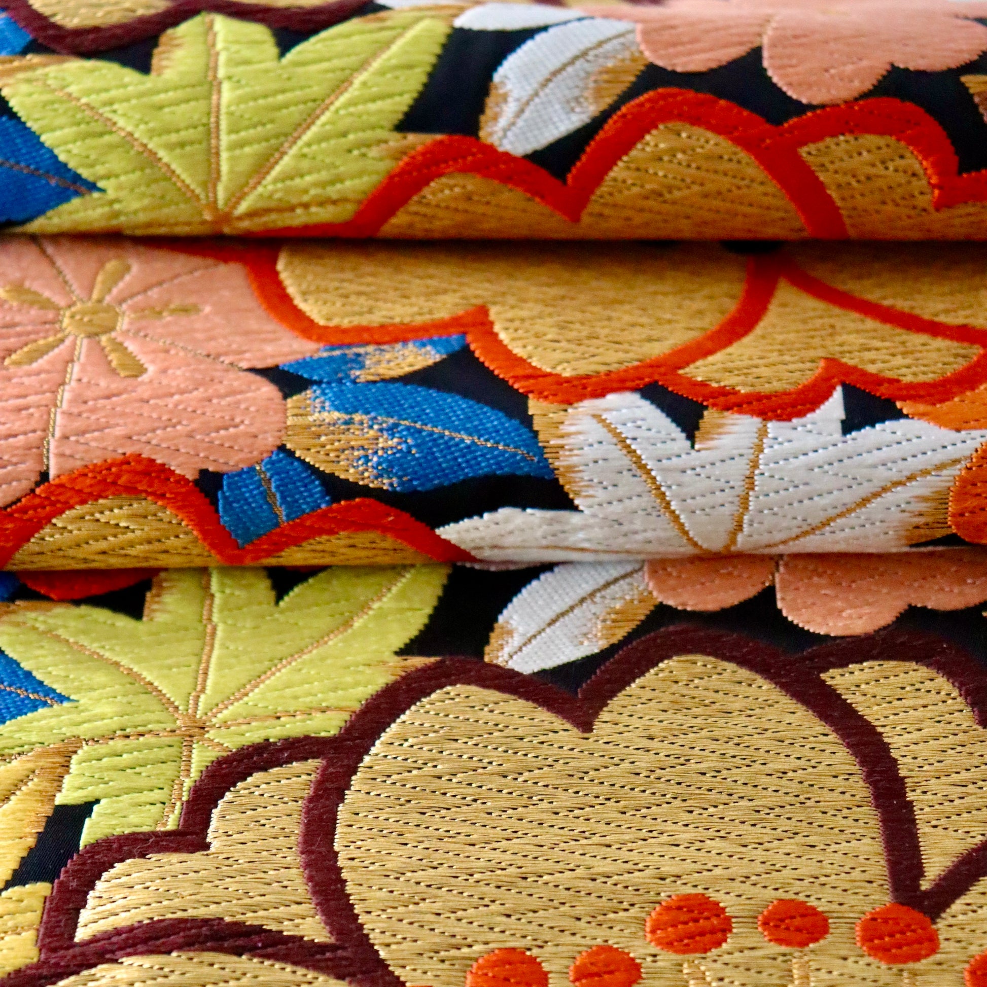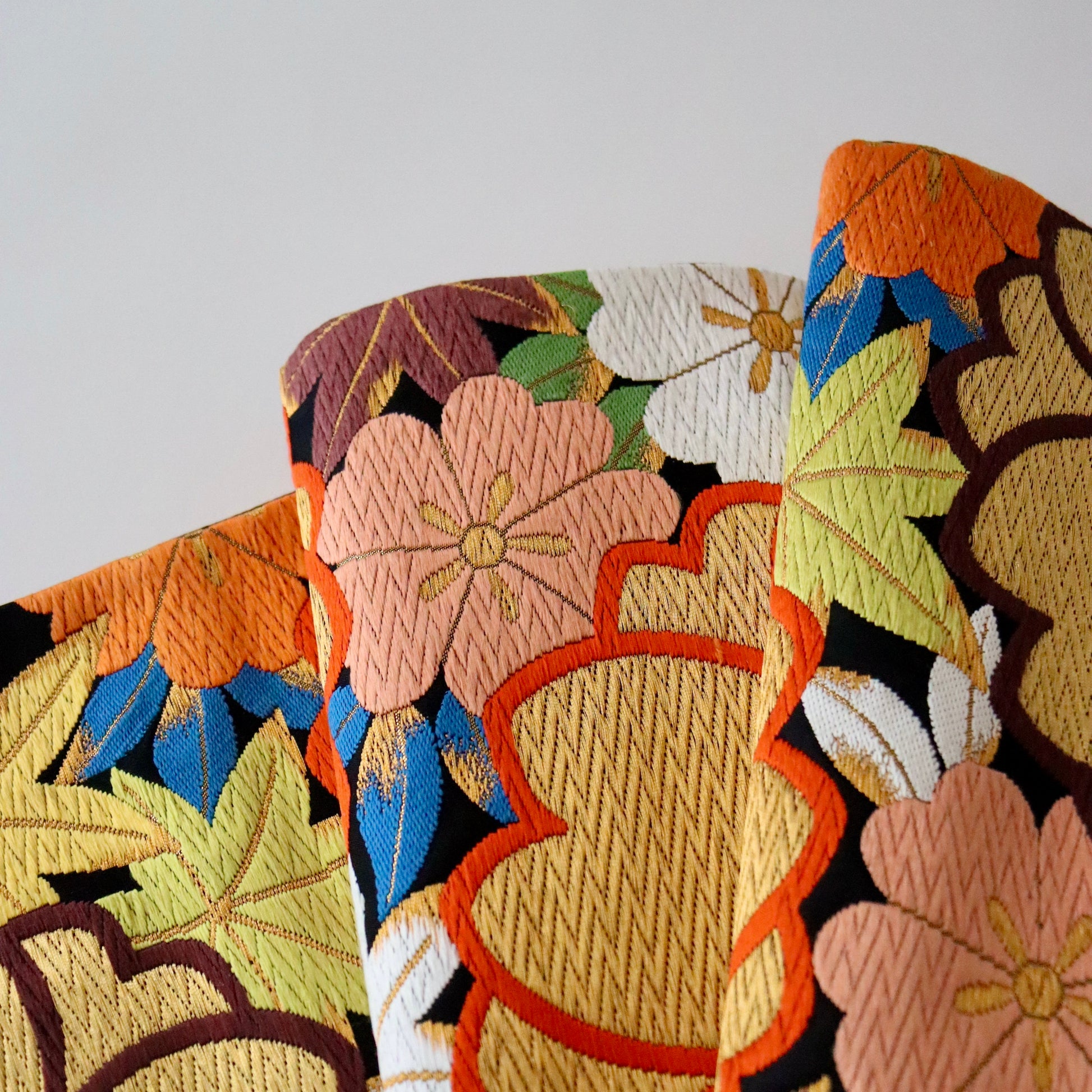 大胆に織り描かれた大輪の桜が目を惹く本作。桜の背景に彩り豊かに敷き詰められた「楓」が優美で可憐な印象を演出。ちょっと目を惹く他にはない意匠ですが、古典文様や絞り染めなど、正統派の振袖に驚くほど調和致します。絹糸が織り成すふっくらとした唐織の表情は「河合美術織物」ならでは。色柄だけでなく、質感でも雰囲気を表現する見事な仕上がりです。純然たる古典文様の振袖にお薦めしたい一本です。