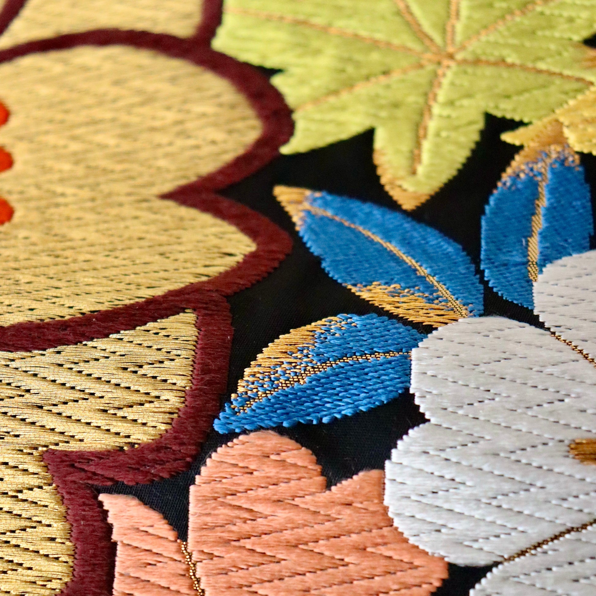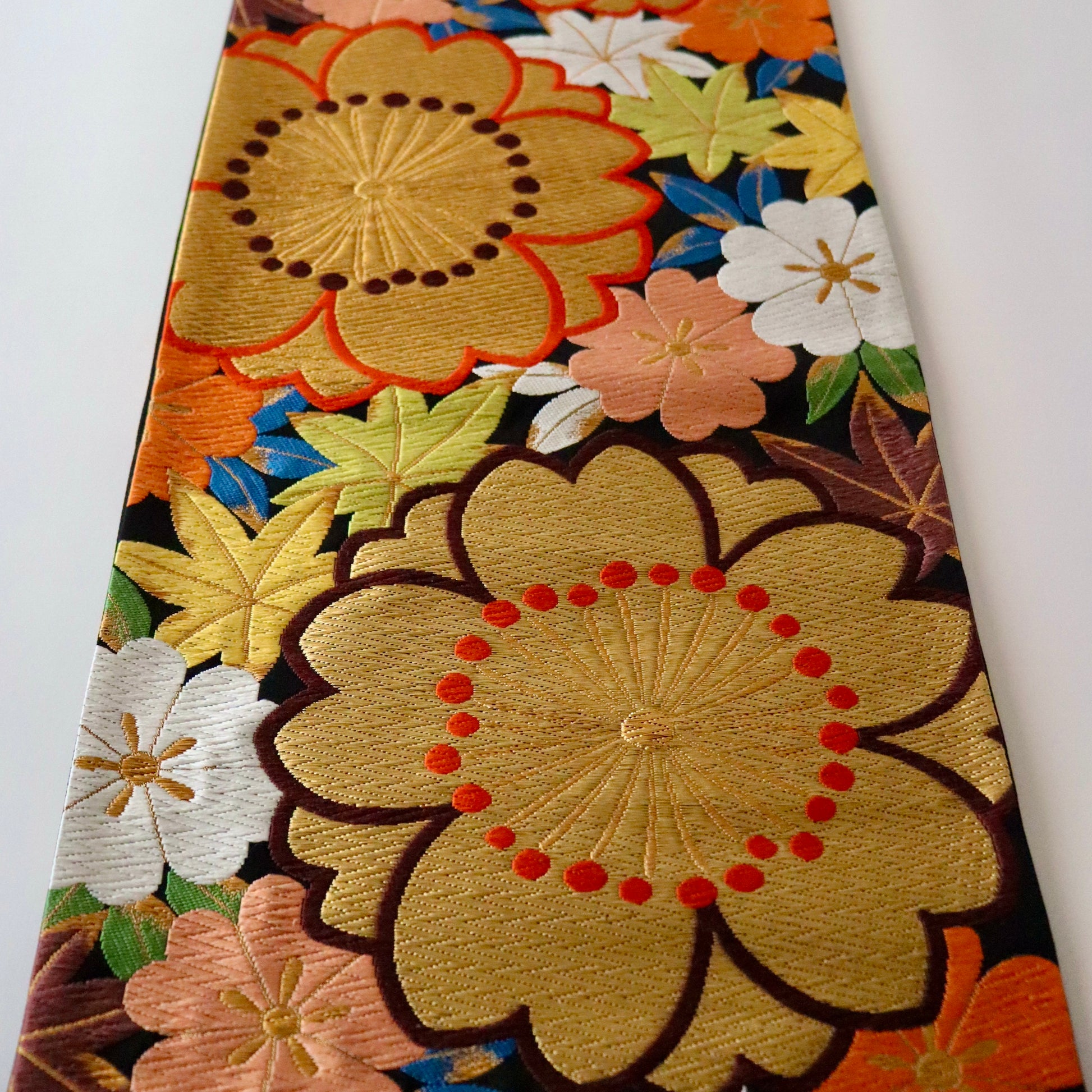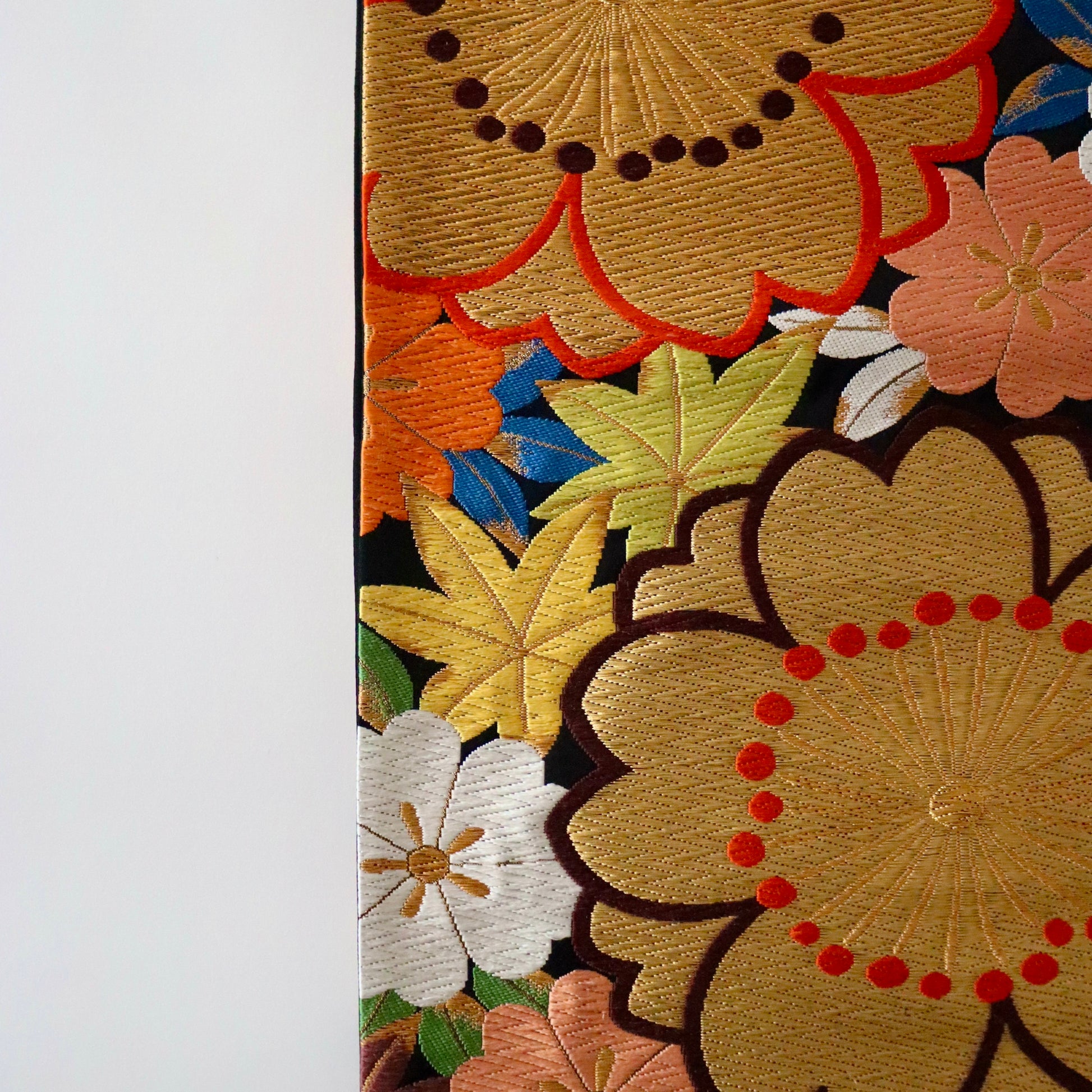 大胆に織り描かれた大輪の桜が目を惹く本作。桜の背景に彩り豊かに敷き詰められた「楓」が優美で可憐な印象を演出。ちょっと目を惹く他にはない意匠ですが、古典文様や絞り染めなど、正統派の振袖に驚くほど調和致します。絹糸が織り成すふっくらとした唐織の表情は「河合美術織物」ならでは。色柄だけでなく、質感でも雰囲気を表現する見事な仕上がりです。純然たる古典文様の振袖にお薦めしたい一本です。