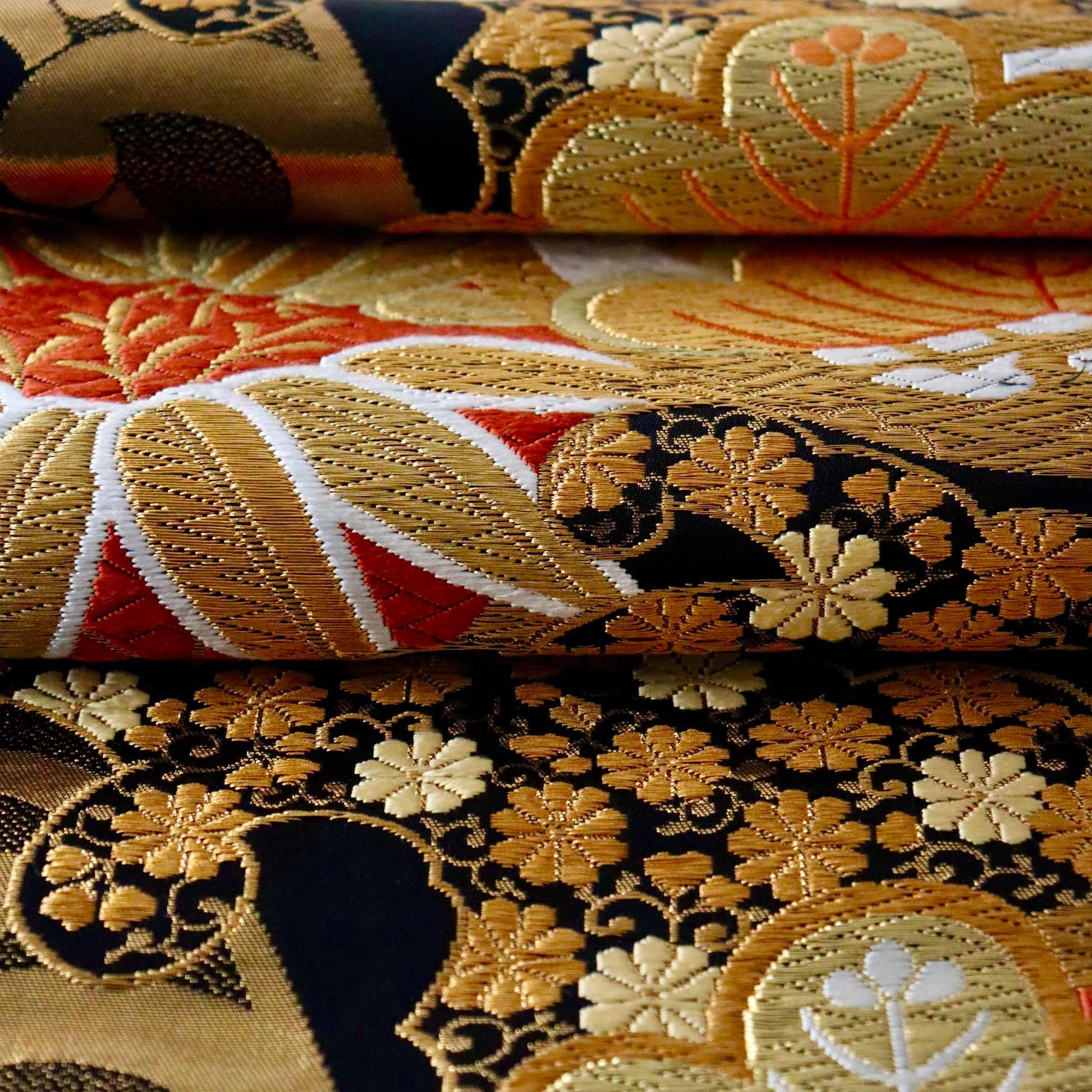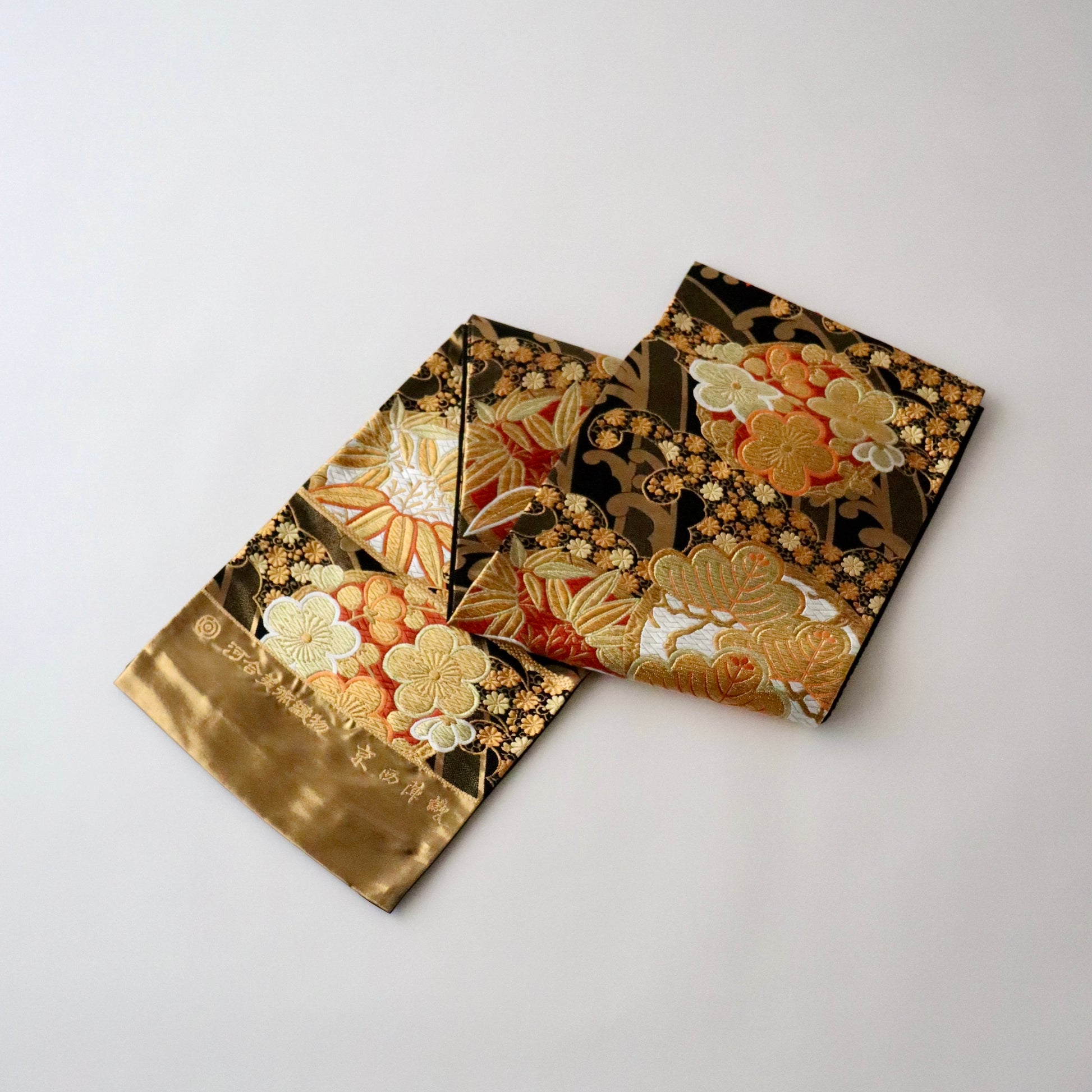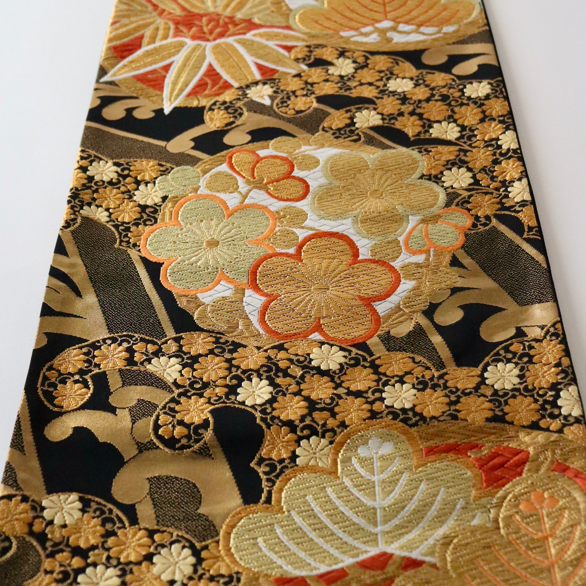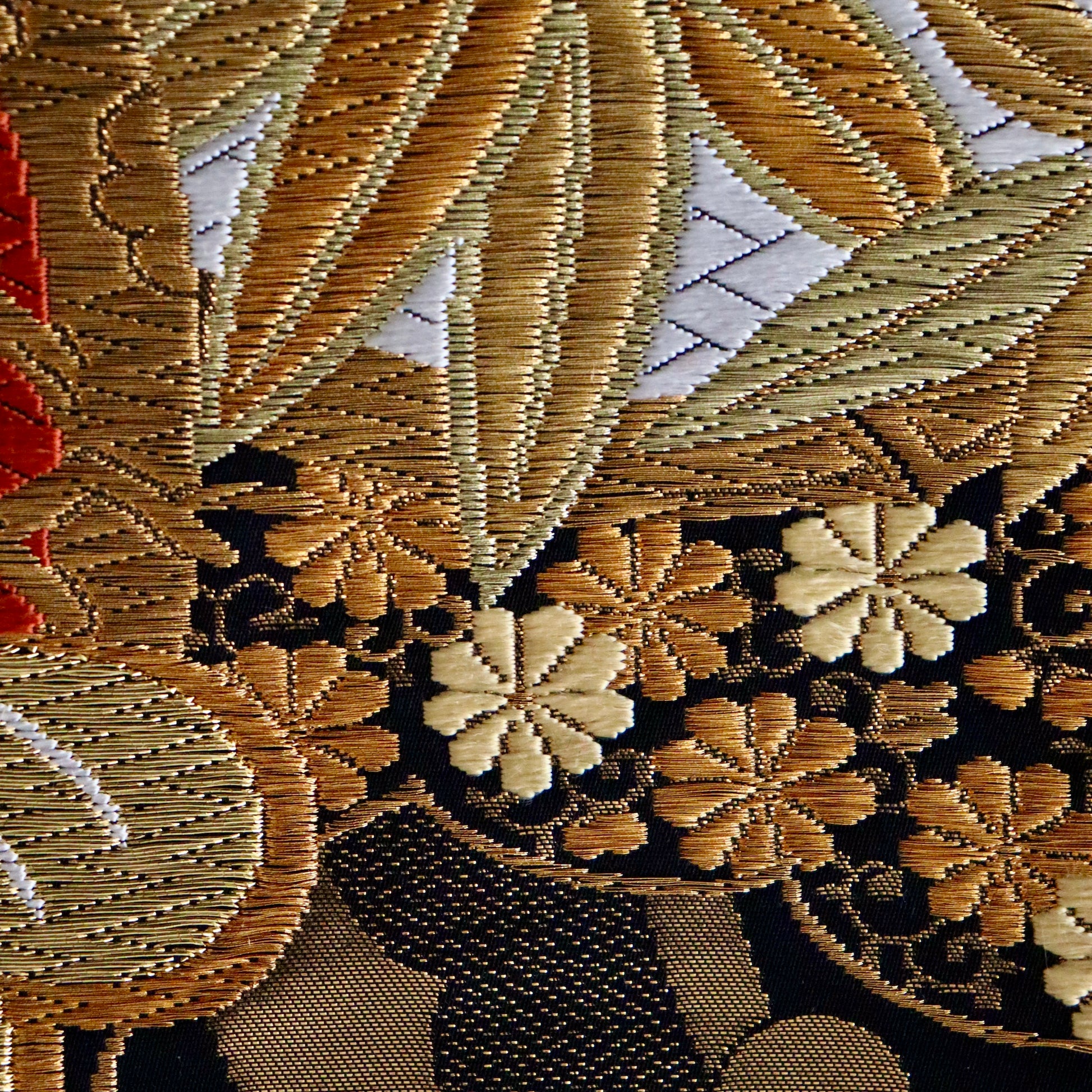 黒と金のコントラストが豪華な仕上がりの本作。今も昔も変わらぬ「重み」のある糸使い・色使いは柄で埋め尽くされた華やかな振袖コーディネートをグッとまとめ上げてくれる存在。「良い帯」ならではの存在感をしっかりと持つ逸品です。吉祥文様の代表格「松竹梅」に優美な波文を重ね織り描いた見事な意匠。細やかに華やかに散りばめられた花々の繊細な彩りも豪華さの中に可憐さを表現しております。慶事の彩りに相応しい非常に美しい袋帯。浮き立つ絹糸が織りなす華やかさと表情が実に美事な一品です。