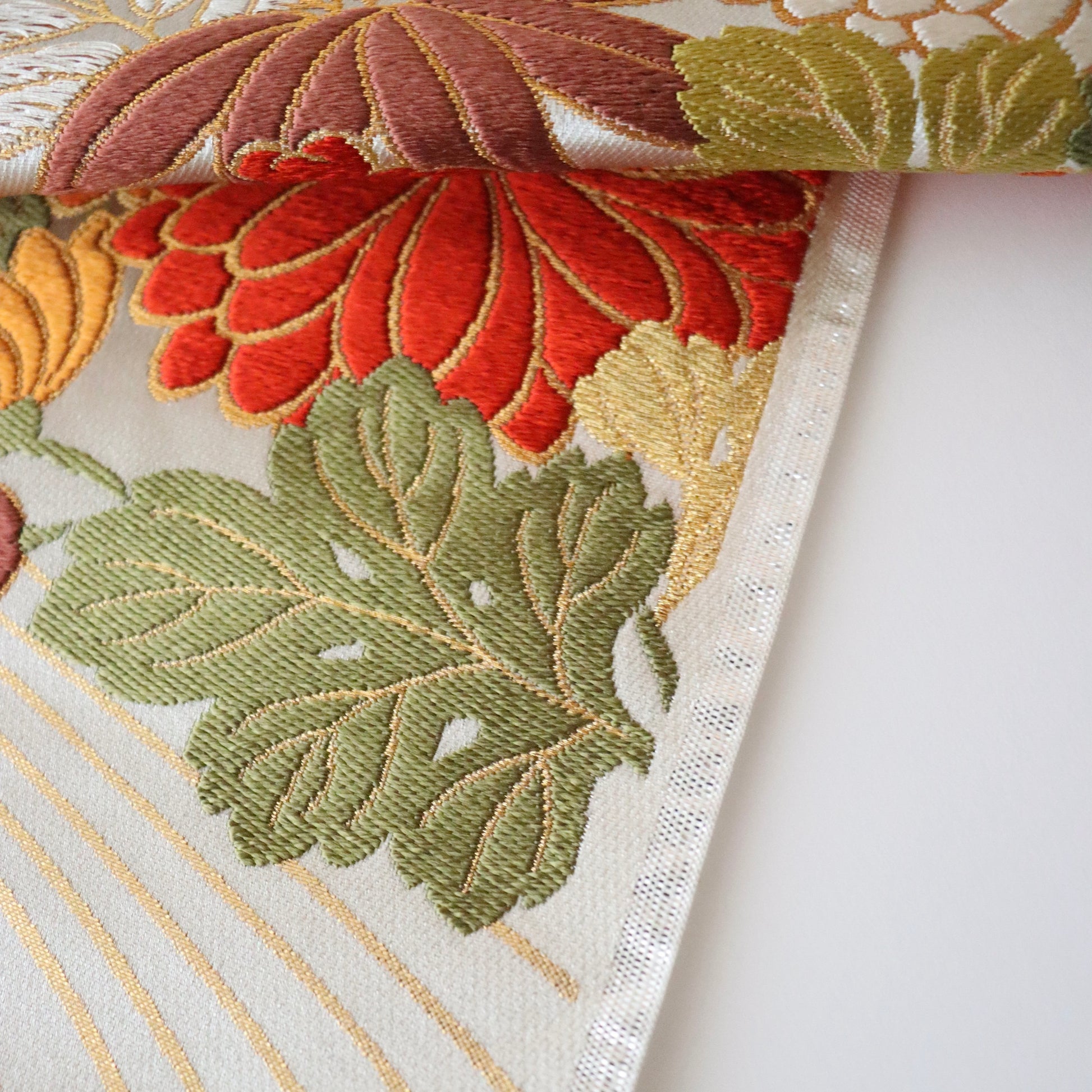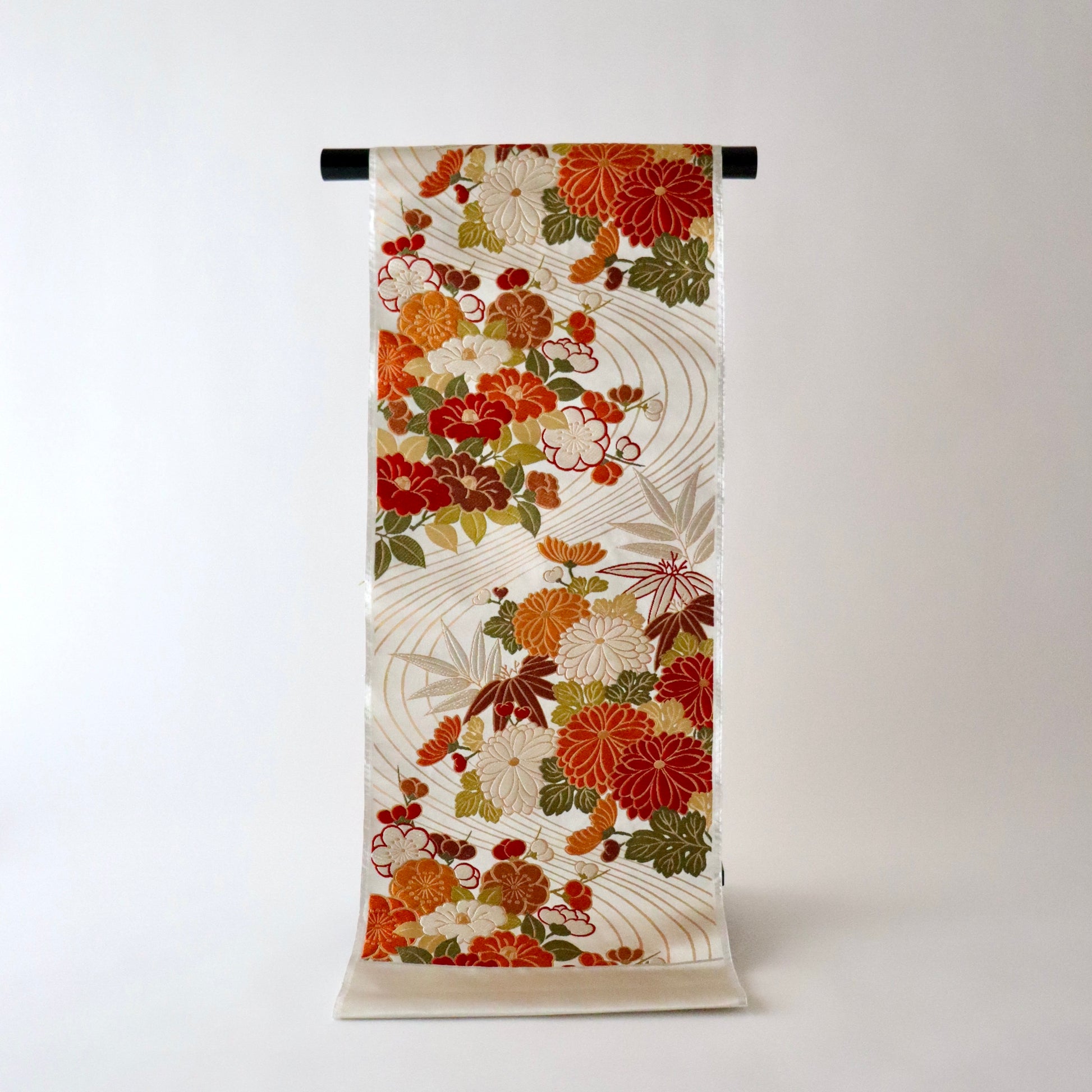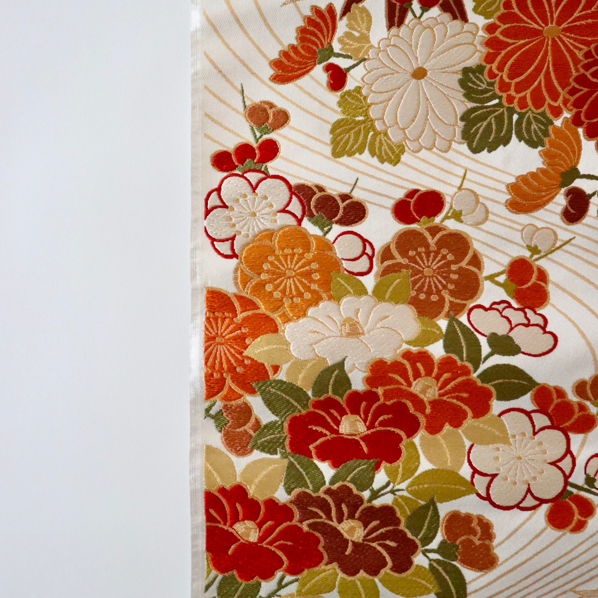 友禅の小袖より意匠取材をし制作された本作。流水と花文を重ねることで躍動感のある意匠に仕上がっております。菊と椿の華やかさだけでなく、流水という「動」が品格のある美しさを演出しているという梅垣織物の卓越した意匠力が伺える逸品です。