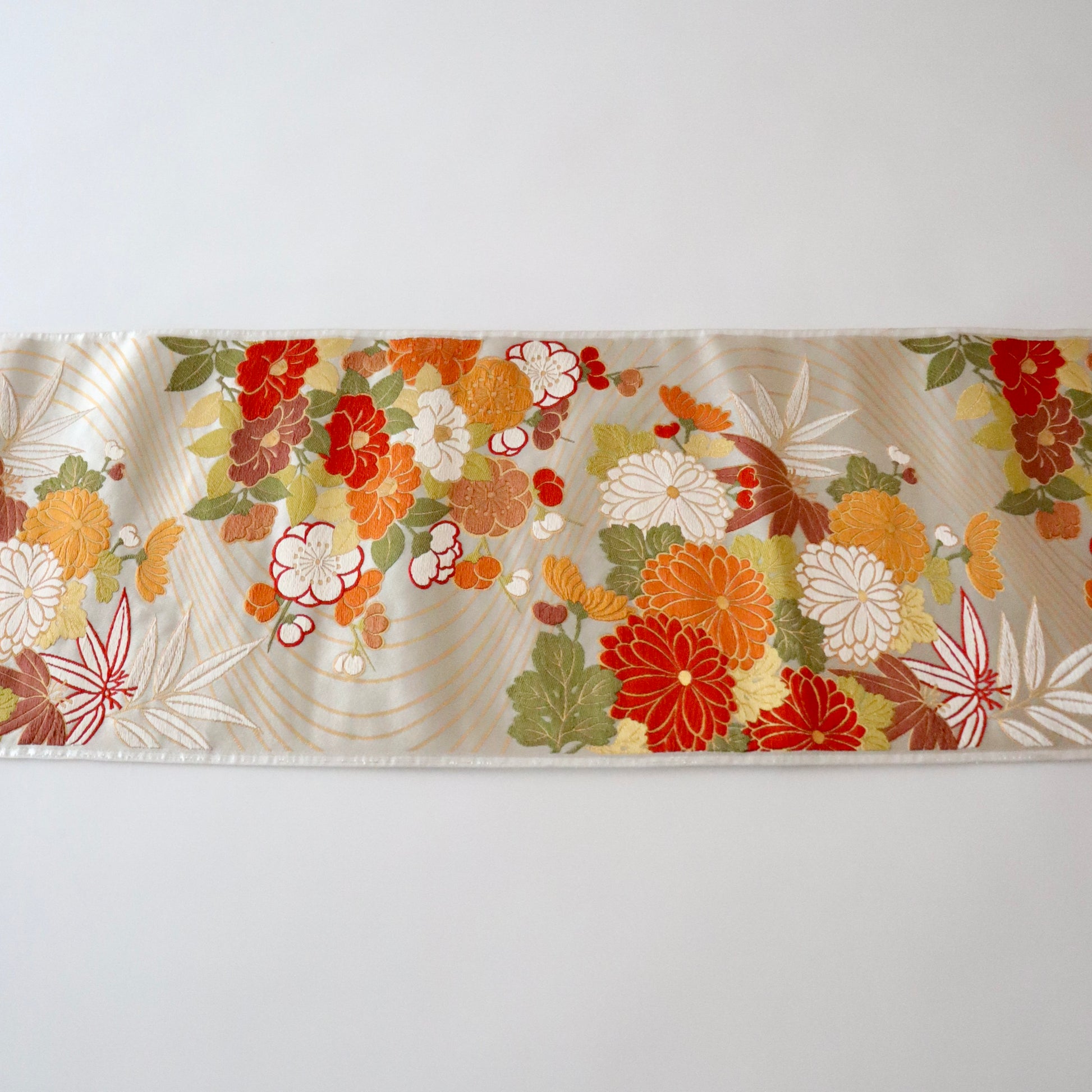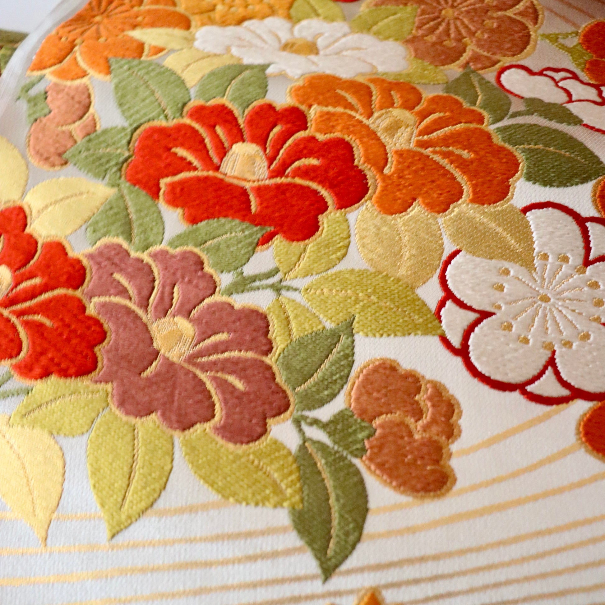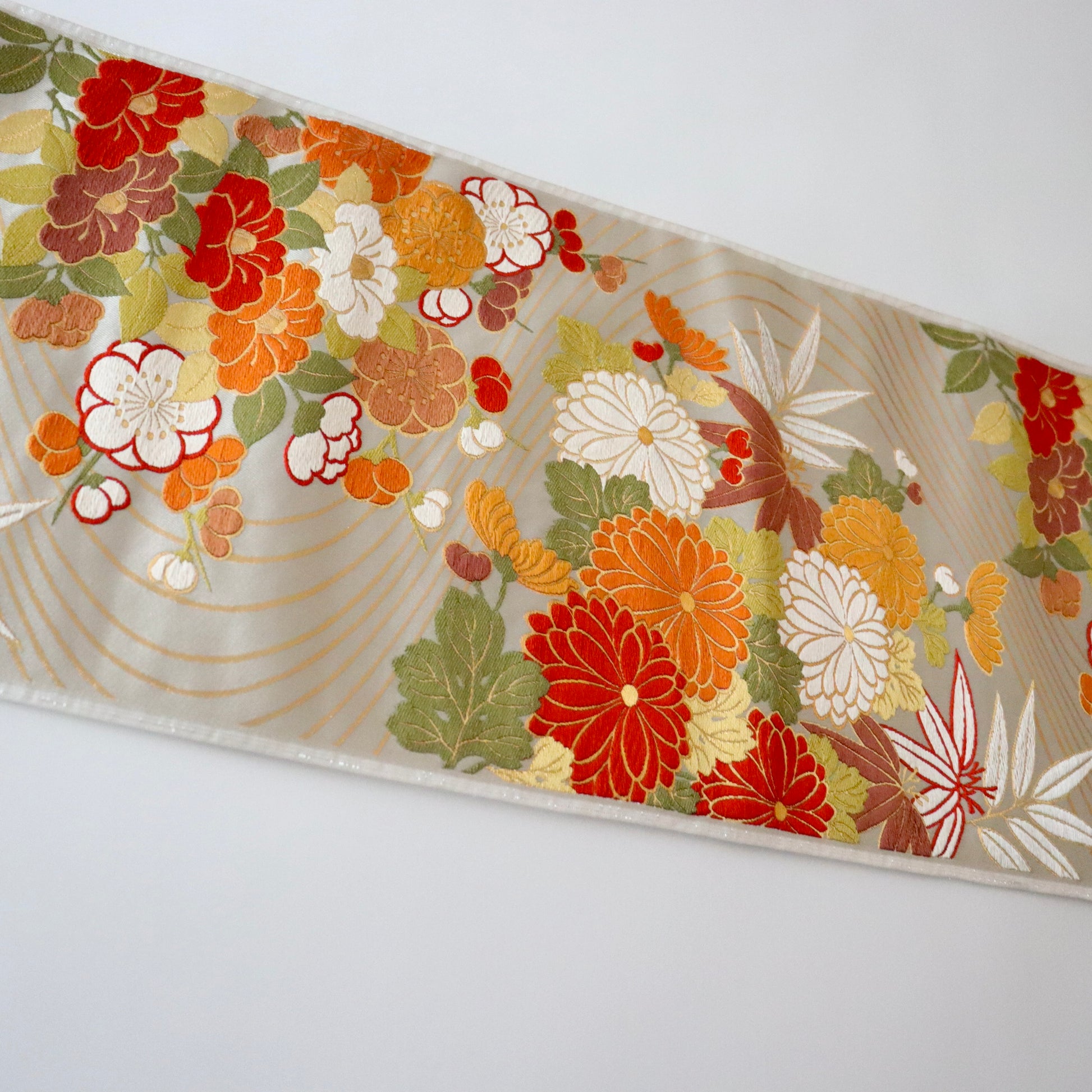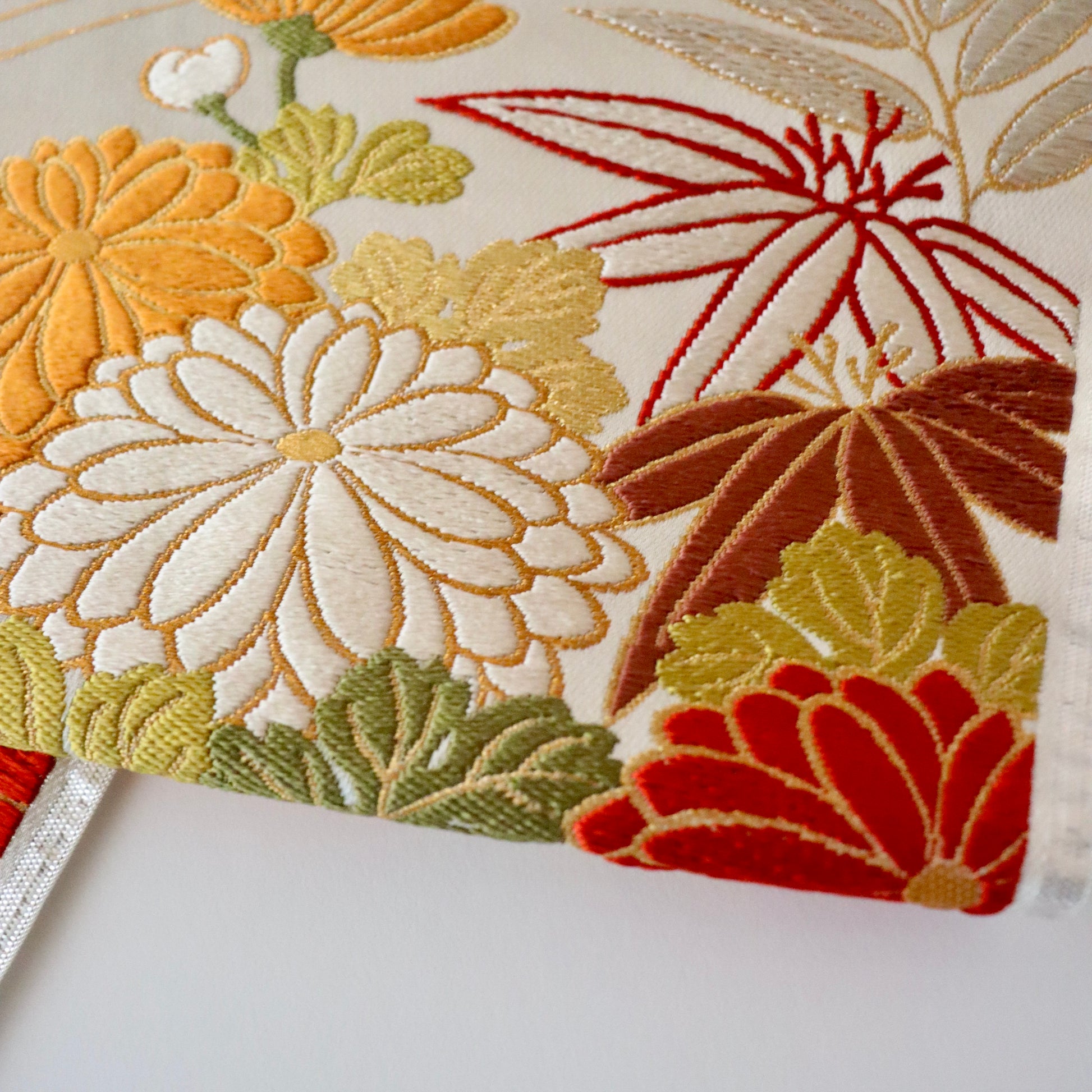 友禅の小袖より意匠取材をし制作された本作。流水と花文を重ねることで躍動感のある意匠に仕上がっております。菊と椿の華やかさだけでなく、流水という「動」が品格のある美しさを演出しているという梅垣織物の卓越した意匠力が伺える逸品です。