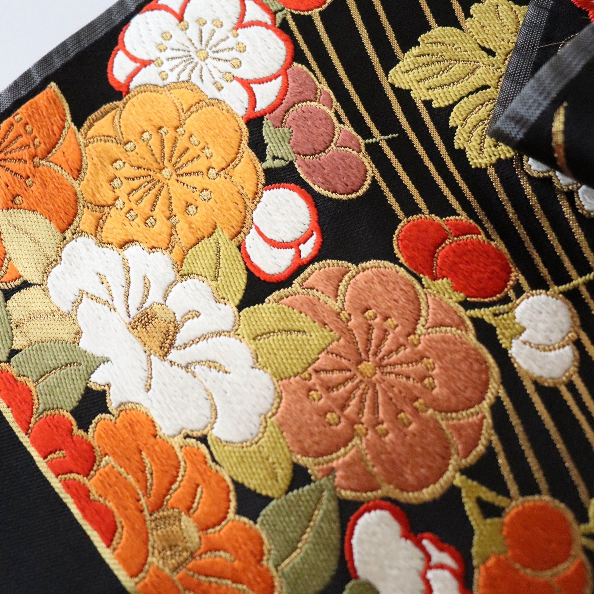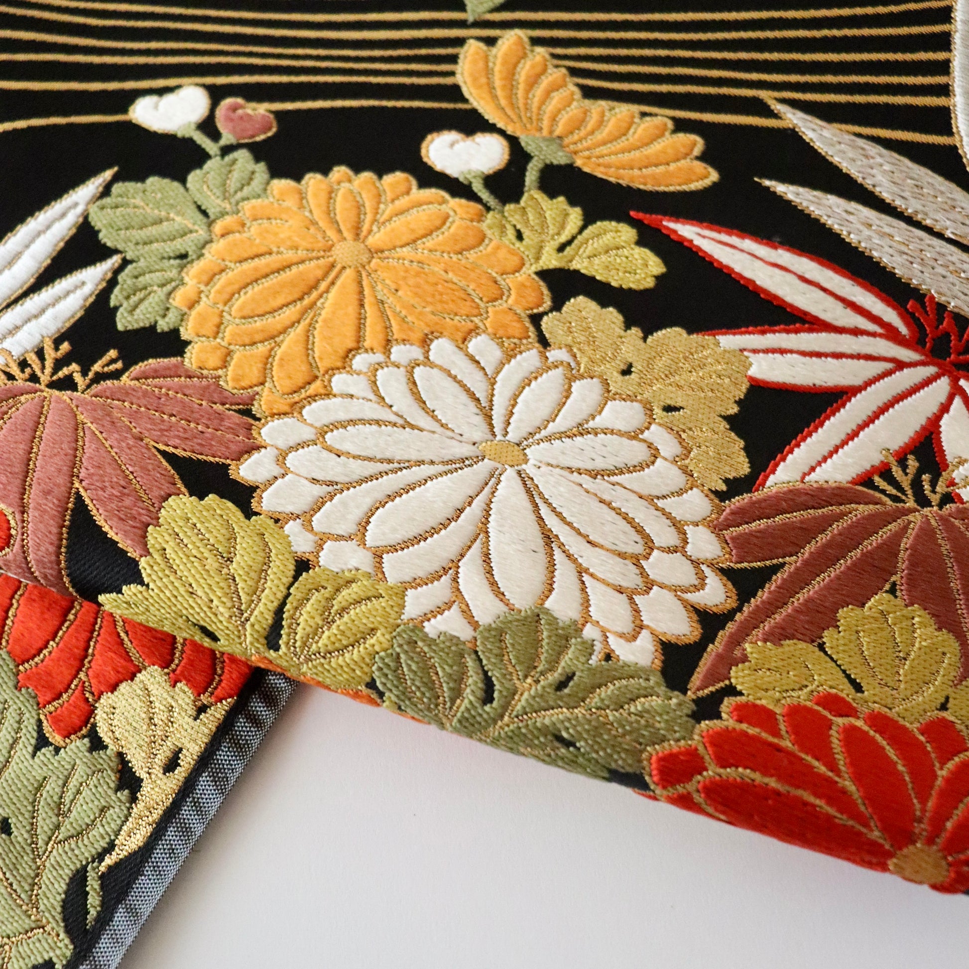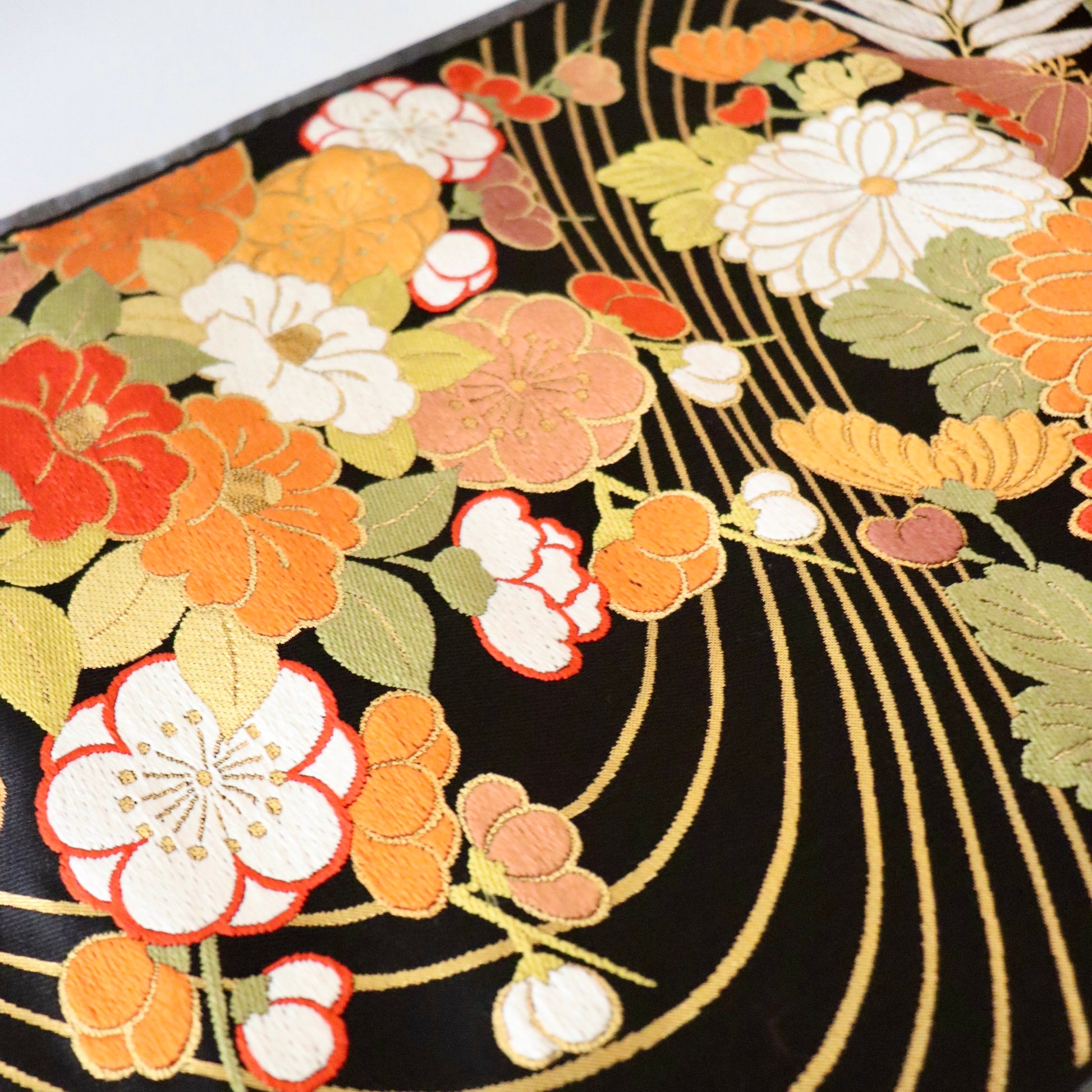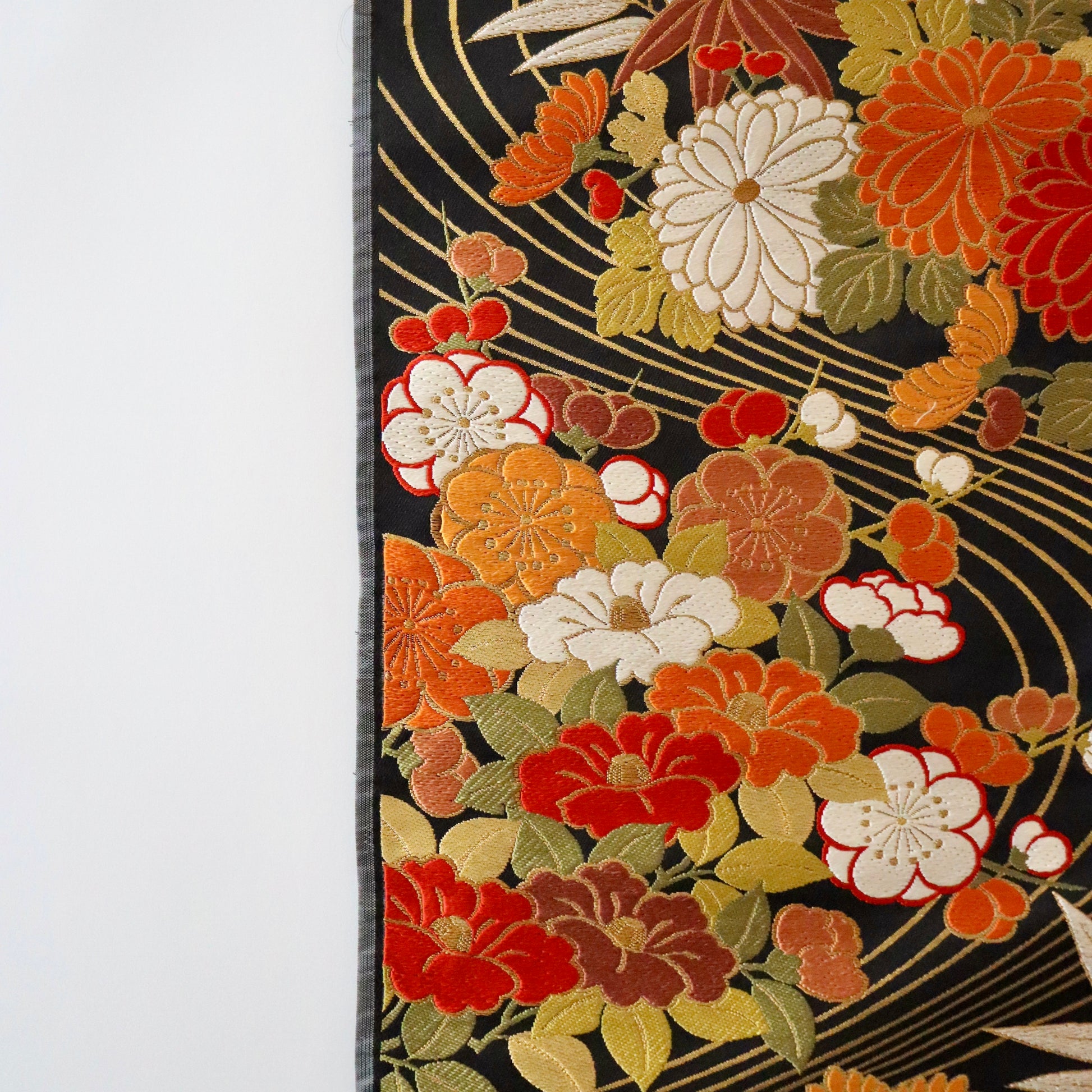 友禅の小袖より意匠取材をし制作された本作。流水と花文を重ねることで躍動感のある意匠に仕上がっております。菊と椿の華やかさだけでなく、流水という「動」が品格のある美しさを演出しているという梅垣織物の卓越した意匠力が伺える逸品です。