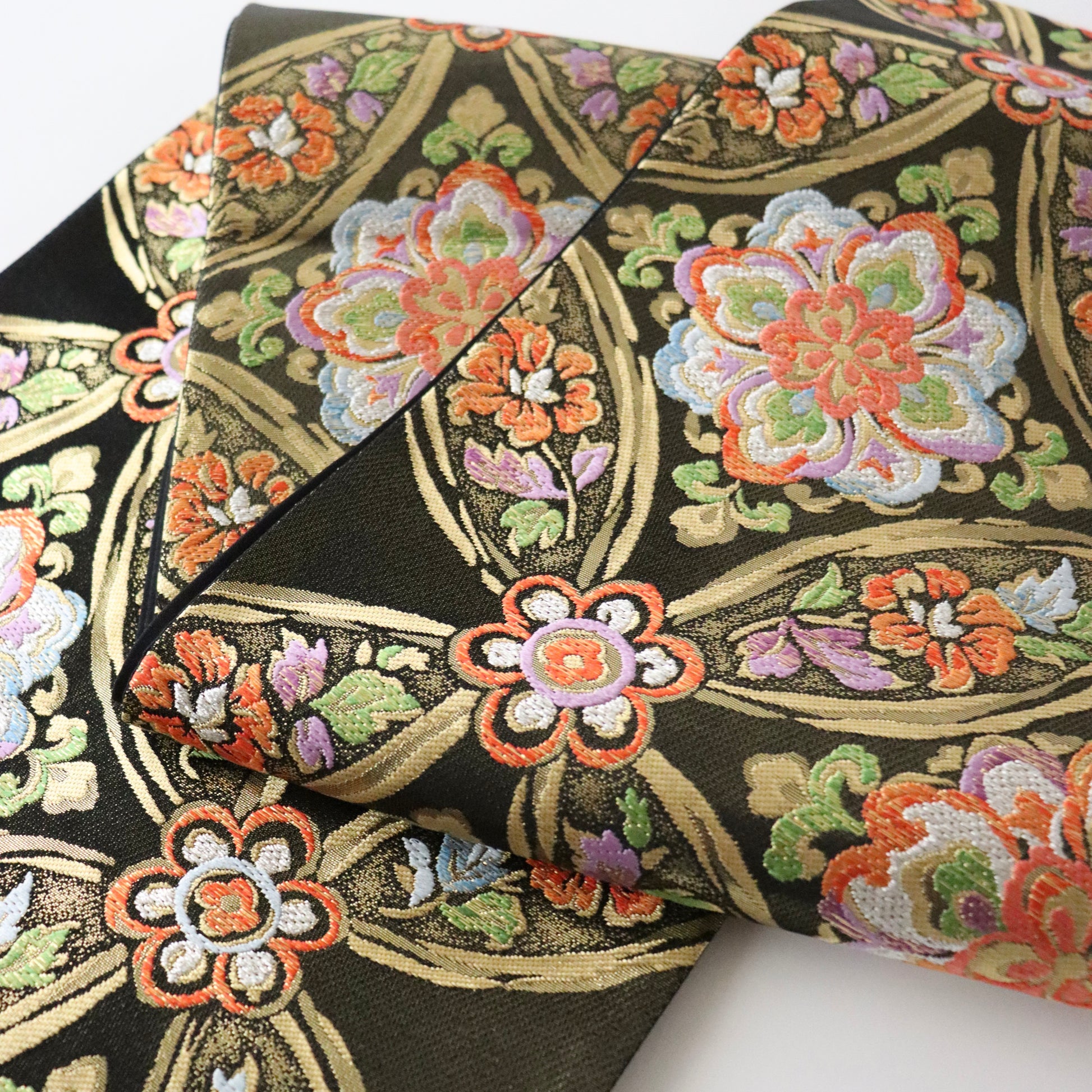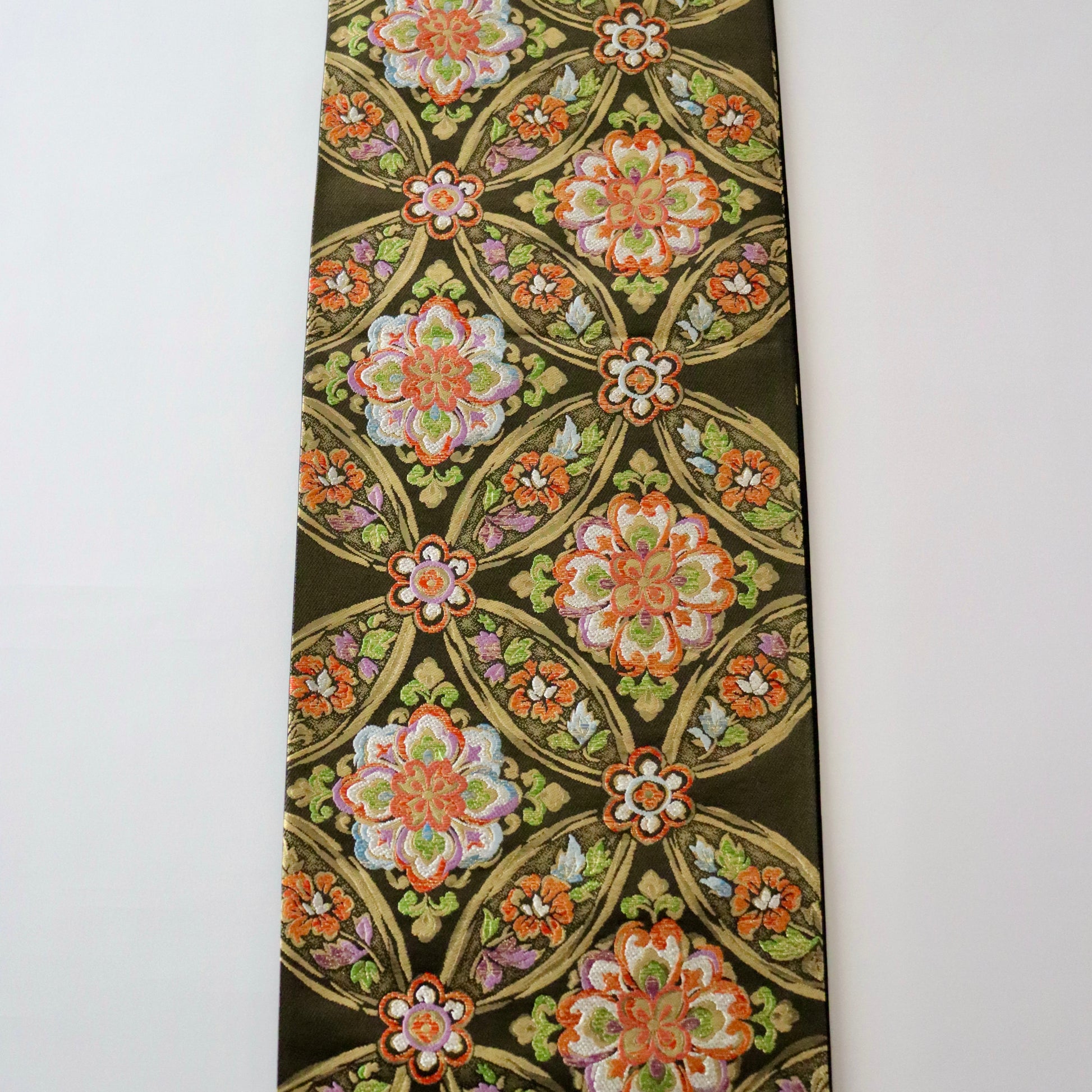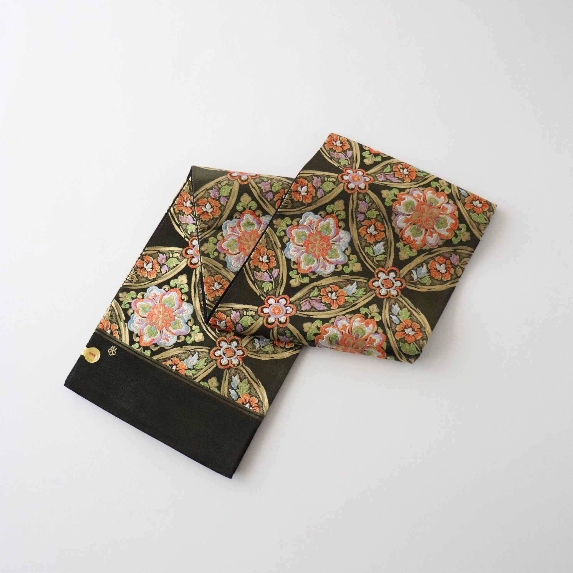 有職文様の代表格「七宝文」を基調にシックかつ華やかな色彩で「華文」を重ね描いた本作。上品な佇まいに絹糸の艶やかさが際立つ見事な織り表情が実に美しい仕上がり。