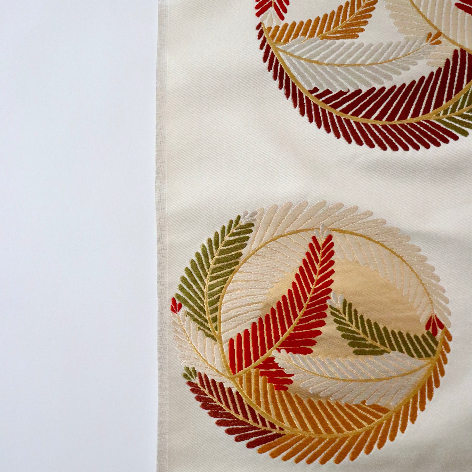 縫箔小袖より意匠取材をして制作された本作。大胆に無地場を活かした柄構図は振袖はもちろん帯締めや帯揚げなどの小物も最大限に引き立てるもので、コーディネート全体を美しく調和させます。すっきりとした意匠は逆に梅垣織物の丁寧かつ高い織技が際立つものとなっていおります。