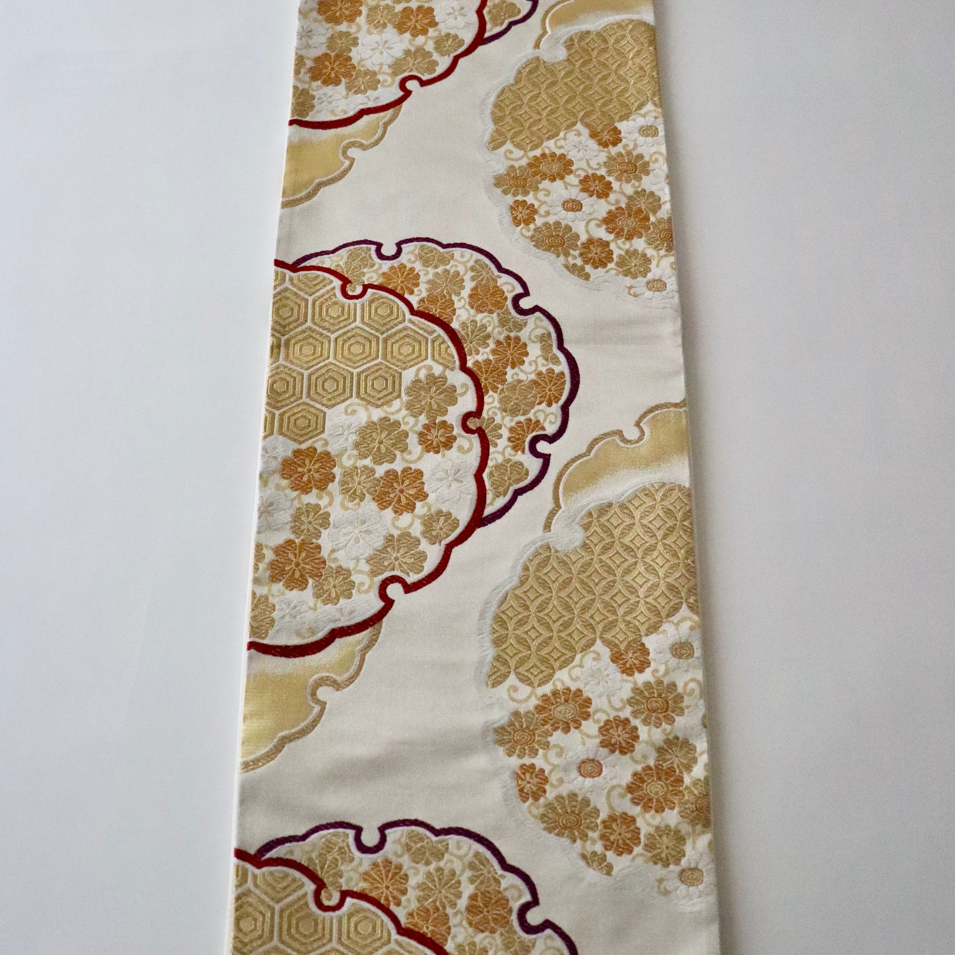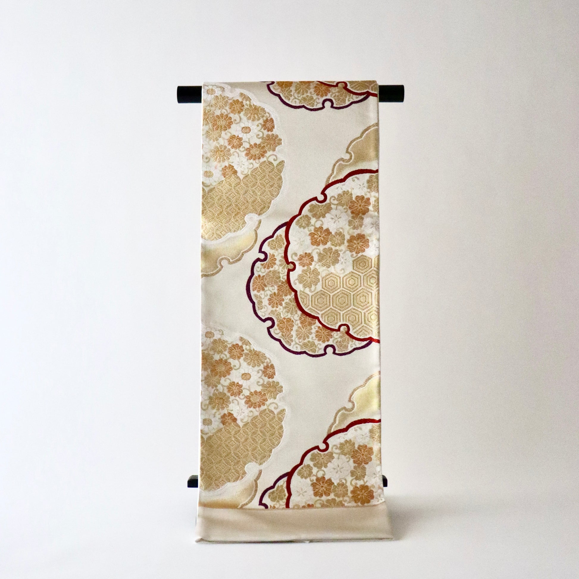 数々の名作を手掛けてきた同工房が振袖向けにと制作した本作は雪輪文様を優美に重ね織り描いた意匠が見事な仕上がり。雪の結晶を意匠化した「雪輪文」は雪解け水が野山を潤し豊作をもたらすという謂れが込められており、また春の訪れも意味する事(諸説あり)から、慶事の席でお召しになられる礼装にとても相応しい柄とも言えます。雪の柄という事で冬の装いに相応しい柄ではありますが、前述の意味合いから春に、そして古くから夏の浴衣や帯にもその意匠が用いられてきた事から、通年で楽しめる意匠として定着しています。様々な言われ意味合いも大切ですが、やはり岡文ならではの卓越した意匠力によって表現された美しさが1番の魅力と言える一本となっております。