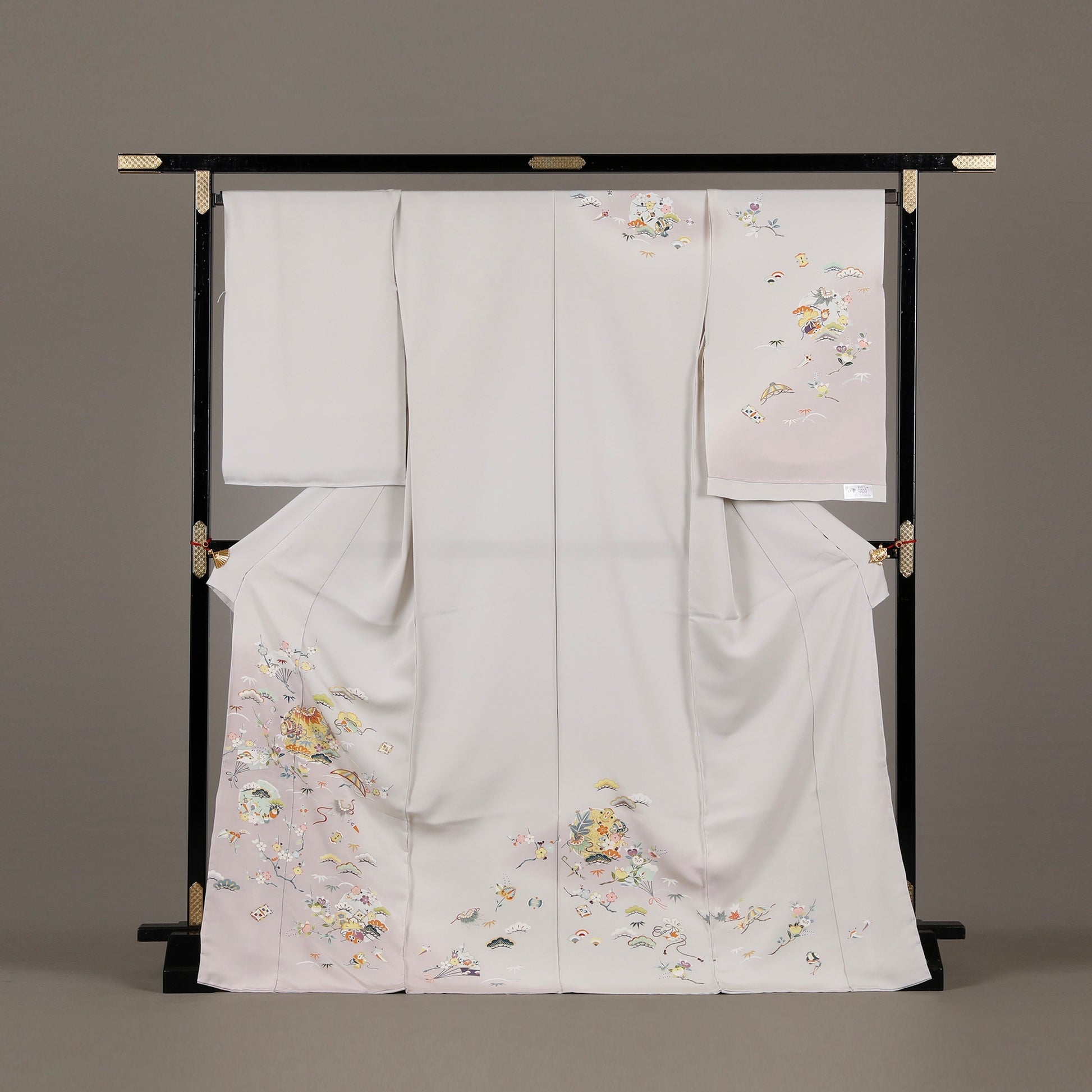 純然たる正統派古典意匠を主な作風とする「菱健」。本作はそうした工房の個性が如実に現れた訪問着です。品のある白花色を地色に、花丸文、松、橘、梅、宝尽くしと吉祥を象徴する文様を無地場を生かした絶妙のバランスで染め描いた見事な構図。柄を詰めすぎず、余白を活かすことでより優美な印象が表現されますが、これは上質な生地と確かな技術の友禅があってこそのもの。京友禅ならではの雅な仕上がりが魅力的な訪問着です。