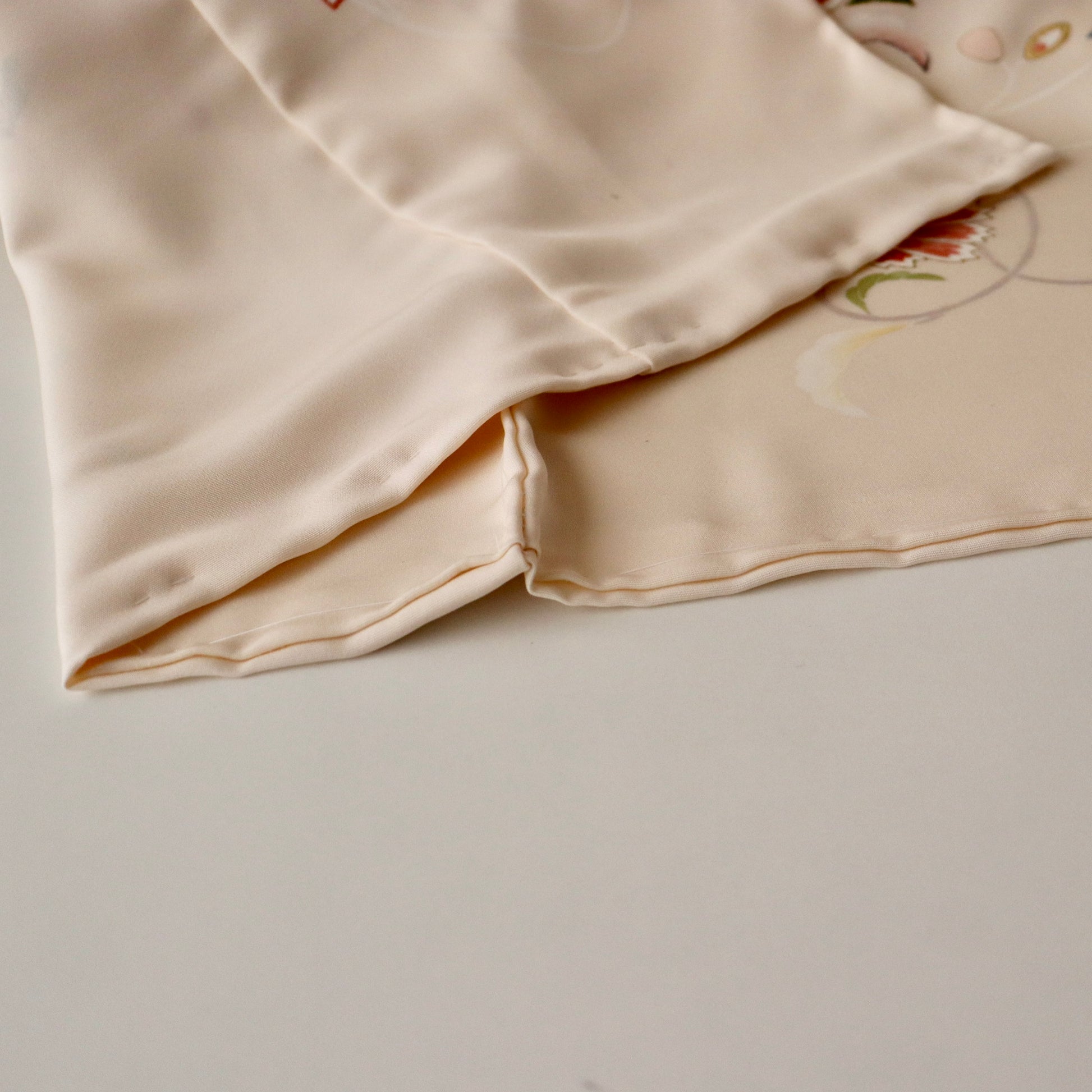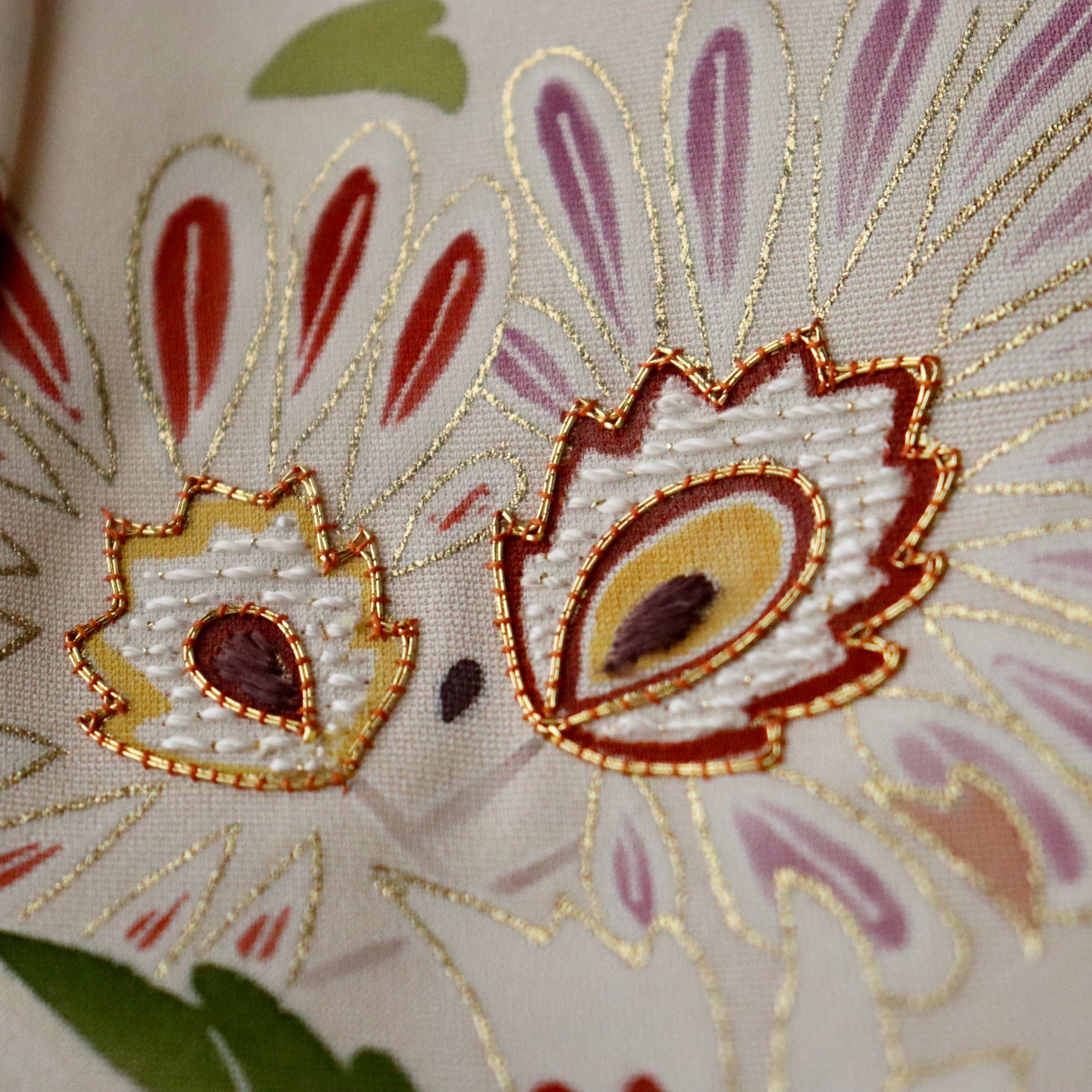 古来より唐草文様の一種として様々な宝物や美術工芸品に描かれてきた空想上の花「宝相華」を基調に、架空の草花でまとめた高橋啓の意匠力が煌めく訪問着。独創的な色彩はどの季節にもマッチする万能性を備え、花々の醸し出す華やかさと雰囲気は上品で可憐な仕上がり。柄一つ一つの大きさも華やかでありながら落ち着いた雰囲気も併せ持つ絶妙なバランスになっております。
